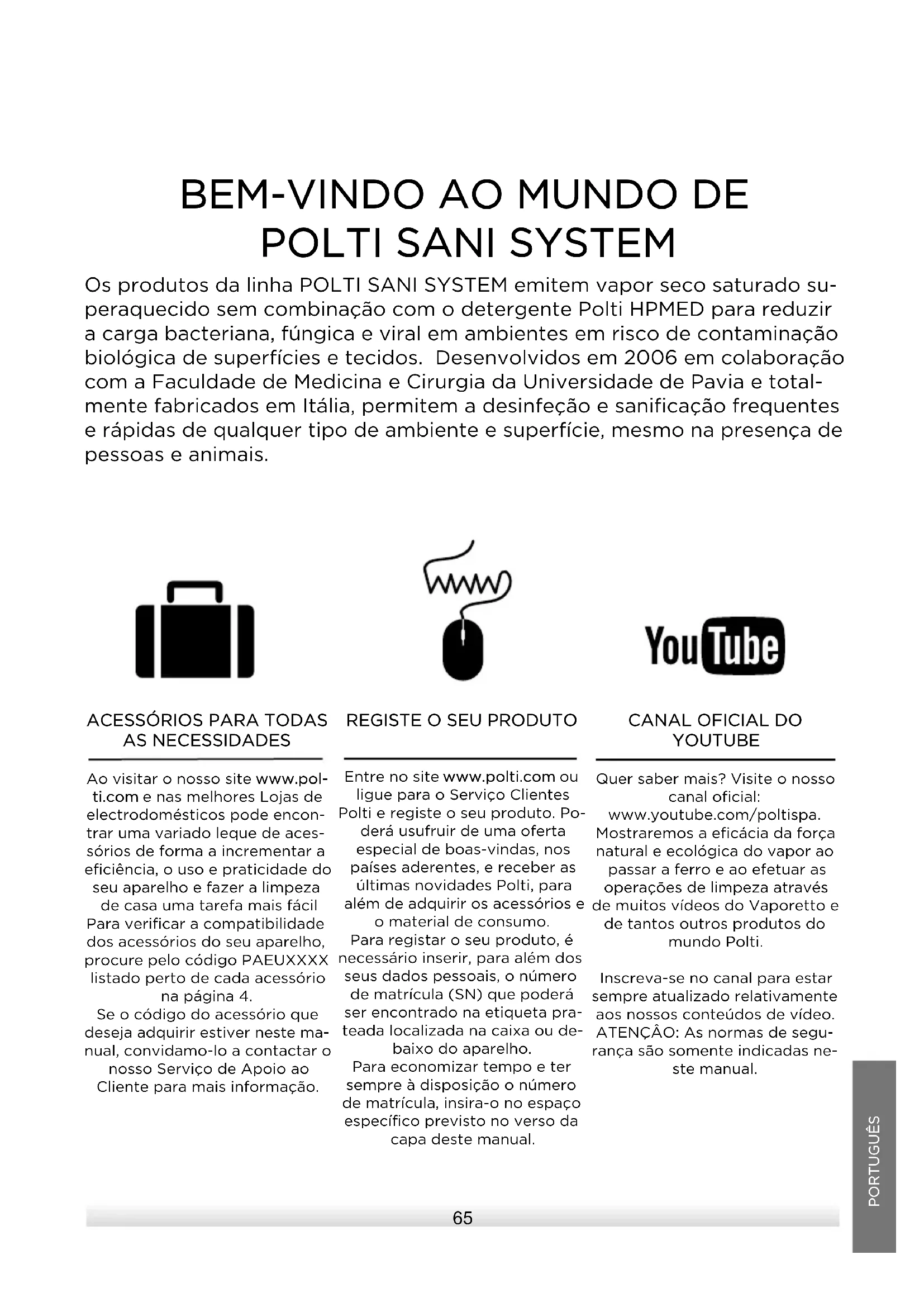 YOUTUBE Quer saber mais? Visite o nosso canal oficial: www.youtube.com/poltispa. Mostraremos a eficácia da força natural e ecológica do vapor ao passar a ferro e ao efetuar as operações de limpeza através de muitos vídeos do Vaporetto e de tantos outros produtos do mundo Polti. Inscreva-se no canal para estar sempre atualizado relativamente aos nossos conteúdos de vídeo. ATENÇÂO: As normas de segu- rança são somente indicadas ne- ste manual.66