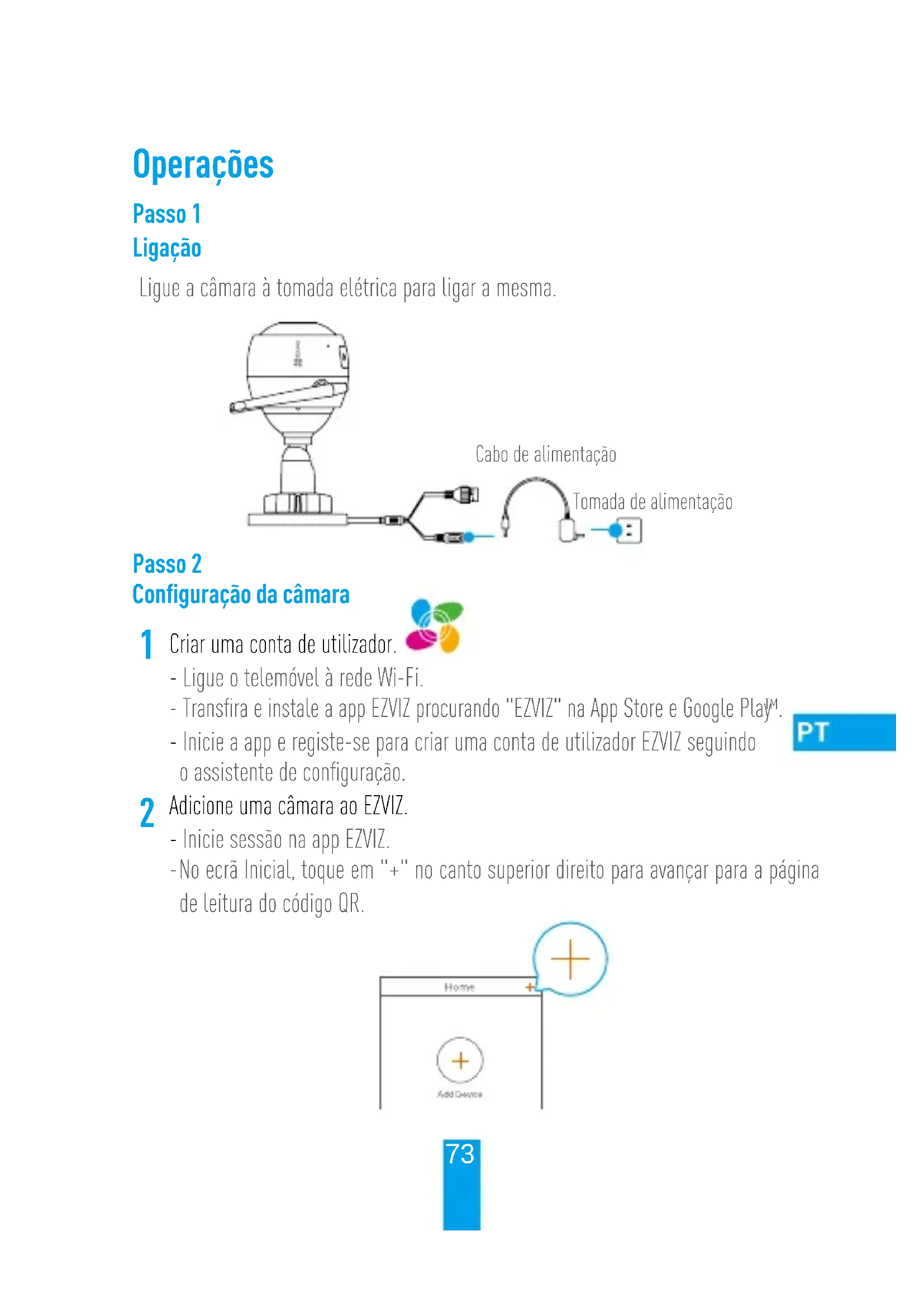 Criar uma conta de utilizador. - Ligue o telemóvel à rede Wi-Fi. - Transfira e instale a app EZVIZ procurando "EZVIZ" na App Store e Google Play