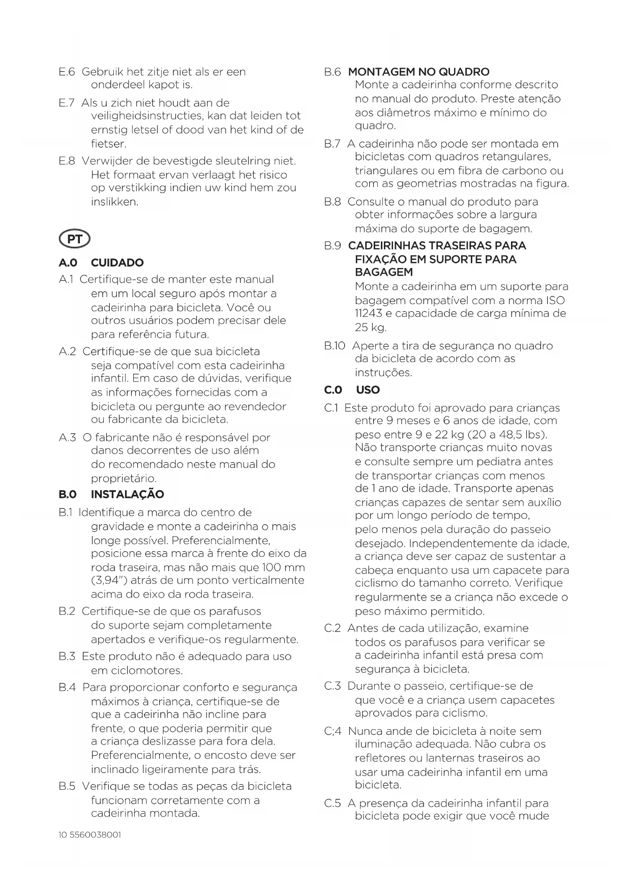 BAGAGEM Monte a cadeirinha em um suporte para bagagem compatível com a norma ISO 11243 e capacidade de carga mínima de 25 kg. B.10 Aperte a tira de segurança no quadro da bicicleta de acordo com as instruções. C.0 USO C.1 Este produto foi aprovado para crianças entre 9 meses e 6 anos de idade, com peso entre 9 e 22 kg (20 a 48,5 lbs). Não transporte crianças muito novas e consulte sempre um pediatra antes de transportar crianças com menos de 1 ano de idade. Transporte apenas crianças capazes de sentar sem auxílio por um longo período de tempo, pelo menos pela duração do passeio desejado. Independentemente da idade, a criança deve ser capaz de sustentar a cabeça enquanto usa um capacete para ciclismo do tamanho correto. Verifique regularmente se a criança não excede o peso máximo permitido. C.2 Antes de cada utilização, examine todos os parafusos para verificar se a cadeirinha infantil está presa com segurança à bicicleta. C.3 Durante o passeio, certifique-se de que você e a criança usem capacetes aprovados para ciclismo. C;4 Nunca ande de bicicleta à noite sem iluminação adequada. Não cubra os refletores ou lanternas traseiros ao usar uma cadeirinha infantil em uma bicicleta. C.5 A presença da cadeirinha infantil para bicicleta pode exigir que você mude115560038001 a maneira que entra e sai da bicicleta. Preste atenção especial a isso. C.6 Antes de cada passeio, certifique-se de que a cadeirinha montada na bicicleta não interfira com o freio, pedais ou guidão. C.7 Sempre use o cinto e certifique-se de apertá-lo corretamente ao redor da criança. Certifique-se de que o cinto e os apoios para pés não estejam soltos ou possam ficar presos em peças móveis, como as rodas. Isso também se aplica ao usar a bicicleta sem uma criança na cadeirinha. C.8 Certifique-se de que roupas, sapatos, brinquedos ou partes do corpo da criança não entrem em contato com quaisquer peças móveis da bicicleta como rodas, cabos e molas do selim. Verifique esses itens regularmente conforme a criança cresce. As molas do selim podem ser cobertas com uma proteção para molas adequada. C.9 Certifique-se de que não haja objetos afiados ao alcance da criança, por exemplo, cabos desgastados. C.10 A criança sentada frequentemente precisa de roupas mais quentes do que o ciclista. Para proteger ambos contra chuvas inesperadas, recomenda-se levar roupas à prova d'água. Nunca passeie em condições perigosas ou adversas, como tempo muito frio, que possam fazer a criança sofrer congelamento. C.11 Verifique a temperatura da cadeirinha antes de sentar a criança, especialmente em dias quentes e ensolarados. C.12 Remova a cadeirinha infantil ao transportar a bicicleta no carro. Aturbulência do ar pode danificar acadeirinha ou afrouxá-la, o que poderia provocar acidentes. C.13 Antes do uso, verifique se há leis e regulamentações nacionais específicas para transportar uma criança em cadeirinhas infantis para bicicleta.