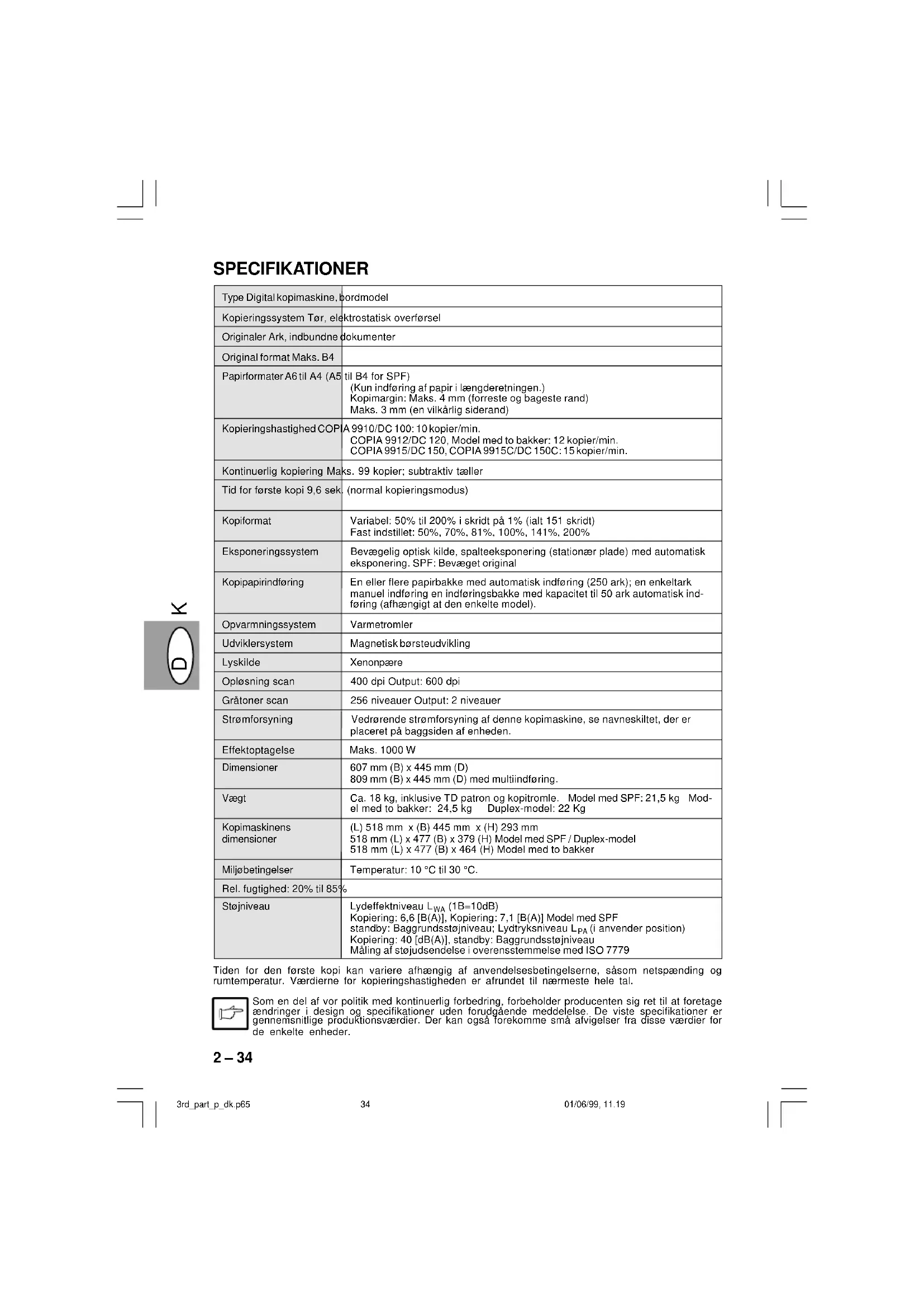 (i anvender position) Kopiering: 40 [dB(A)], standby: Baggrundsstøjniveau Måling af støjudsendelse i overensstemmelse med ISO 7779 SPECIFIKATIONER Tiden for den første kopi kan variere afhængig af anvendelsesbetingelserne, såsom netspænding og rumtemperatur. Værdierne for kopieringshastigheden er afrundet til nærmeste hele tal. Som en del af vor politik med kontinuerlig forbedring, forbeholder producenten sig ret til at foretage ændringer i design og specifikationer uden forudgående meddelelse. De viste specifikationer er gennemsnitlige produktionsværdier. Der kan også forekomme små afvigelser fra disse værdier for de enkelte enheder. 3rd_part_p_dk.p65 01/06/99, 11.1934PDK 2–35 ESPECIFICAÇÕES Tipo Copiadora digital, modelo de mesa Sistema de copiado A seco, transferimento eletrostático Originais Folhas, documentos encadernados Formato dos originais Max. B4 Formato das cópias A6 até A4 (A5 até 4 para SPF) (Somente alimentação longitudinal do papel de cópia) Vazio de imagem: máx. 4 mm (bordos de entrada e de saída) Máx. 3 mm (qualquer um dos bordos) Velocidade do copiado COPIA 9910/DC 100: 10 cópias / minuto COPIA 9912/DC 120, modelo com duas bandejas: 12 cópias / minuto COPIA 9915/DC 150, COPIA 9915C/DC 150C: 15 cópias / minuto Copiado múltiplo Máx. 99 cópias; contador retrógrado Tempo para a 9,6 seg. (modo de copiado normal) primeira cópia Proporção de Variável: 50% até 200% em incrementos de 1% (total 151 impulsos) aumentos da cópia Estabelecidos: 50%, 70%, 81%, 100%, 141%, 200% Sistema de exposição Exposição a fenda de sistema ótico (lâmina de exposição automática. SPF: original em movimento Alimentação do Uma ou duas bandejas com alimentação automática (250 folhas); uma papel de cópia entrad de alimentação bypass manual para folha única o uma bandeja bypass capacitada para alimentar automáticamente 50 folhas (a depender do modelo). Sistema fusor Rolo fusor Sistema de revelação Revelação do pincel magnético Fonte de luz Lâmpada Xenon Resolução Sinal el etrônico: 400 dpi Saída: 600 dpi Graduação Sinal eletrônico: 256 níveis Saída: 2 níveis Alimentação elétrica Para exigências de alimentação desta copiadora, ver o rótulo de características situado na parte posterior da mesma. Consumo elétrico Máx. 1000 W Dimensões generais 607 mm ( An.) x 445 mm ( F) 809 mm ( An.) x 445 mm ( F) com bypass. Peso 18 Kg, incluso cartuchos TD e tambor. Modelo com SPF: 21,5 kg Modelo com duas bandejas: 24,5 kg Modelo Duplex: 22 Kg Dimensão 518 mm (An.) x 445 mm (F) x 293 mm (AI.) da copiadora 518 mm (An.) x 477 mm (F) x 379 mm (AI.) modelo com SPF/modelo Duplex 518 mm (L) x 477 (B) x 464 (H) modelo com duas bandejas Condições ambiente Temperatura : de 10°C até 30°C Umidade Umidade 20% a 85% Nível de acústica Nível de emissão acústica Lwa ( 1B = 10 dB ) Copiando: 6,6 [ B (A) ], Copiando: 7,1 [B (A)] modelo com SPF Standby: nível de pressão acústica Lpa (posições adjacentes) Copiando 40 [ dB (A) ], standby: nível de acústica de fundo Registro das emissões acústicas conforme ISO 7779. O tempo para a primeira cópia pode variar á segunda das condições de funcionamento. Como por exemplo a atenção á temperatura do lugar e a alimentação da corrente. Os valores para a velocidade do copiado são aproximativos ao número inteiro mais próximo. Como parte da nossa política de contínuo progresso, o fabricante se reserva o direito de introduzir modificações ao projeto e características sem prévio aviso destinadas a melhorar o produto. Os valores de rendimento especificados são nominais para unidades de produção. Em algumas unidades podem existir divergências con estes valores. 3rd_part_p_dk.p65 01/06/99, 15.1435PDK 2–36 ESPECIFICAÇÕES PARA A VERSÃO DE 120 V Tipo Copiadora digital, modelo de mesa Sistema de copiado A seco, transferimento eletrostático Originais Folhas, documentos encadernados Formato dos originais Máx. 10” x 14” Formato das cópias 8-12” x 14” até 3-1/2” x 5-1/2” (Somente alimentação longitudinal do papel de cópia) Vazio de imagem: Máx. 5/32” (4 mm) (bordos de entrada e de saída) Máx. 1/8” (3 mm) (qualquer um dos bordos) Velocidade do copiado COPIA 9910: 10 cópias / minuto COPIA 9912, modelo com duas bandejas: 12 cópias / minuto COPIA 9915, COPIA 9915C: 15 cópias / minuto Copiado múltiplo Máx. 99 cópias; contador retrógrado Tempo para a 9,6 seg. (modo de copiado normal) primeira cópia 16,0 seg. ou inferior (copiado em pré aquecimento) 23,0 seg. ou inferior (copiado em desconexão automática de corrente) 23,0 seg. ou inferior (copiado imediatamente depois da conexão com a corrente) Proporção de Variável: 50% até 200% em incrementos de 1% (total 151 impulsos) aumentos da cópia Estabelecidos: 50%, 64%, 78%, 100%, 129%, 200% Sistema de exposição Exposição a fenda de sistema ótico (lâmina de exposição automática. SPF: original em movimento Alimentação do Uma o duas bandejas com alimentação automática (250 folhas); uma entrad de papel de cópia alimentação bypass manual para folha única o uma bandeja bypass capacitada para alimentar automáticamente 50 folhas (a depender do modelo). Sistema fusor Rolo fusor Sistema de revelação Revelação do pincel magnético Fonte de luz Lâmpada Xenon Resolução Sinal el etrônico: 400 dpi Saída: 600 dpi Graduação Sinal eletrônico: 256 níveis Saída: 2 níveis Alimentação elétrica Para exigências de alimentação desta copiadora, ver o rótulo de características situado na parte posterior da mesma. Consumo elétrico Máx. 1000 W Dimensões generais 607 mm (An.) x 445 mm (F) (23.9” (An.) x 17.5” (F)) 809 mm (An.) x 445 mm (F) (31.9” (An.) x 17.5” (F)) com bypass. Peso 18 Kg (39,7 lbs), incluso cartuchos TD e tambor. Modelo com SPF: 21,5 kg (47,3 lbs) Modelo com duas bandejas: 24,5 kg Modelo Duplex: 22 Kg Dimensão 518 mm (An.) x 445 mm (F) x 293 mm (AI.) (20,4” (An.) x