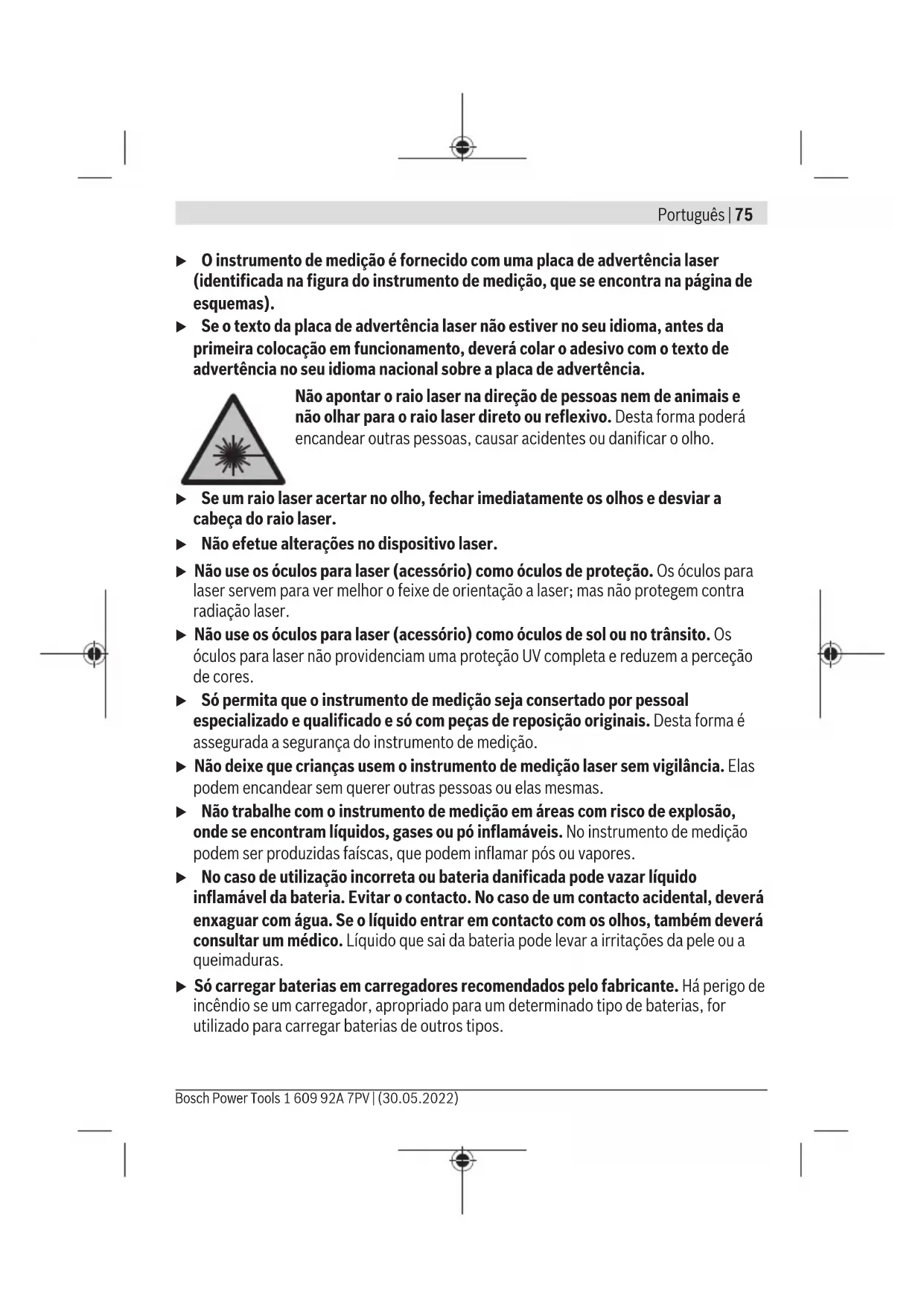 pueda causar su operación no deseada. El símbolo es solamente válido, si también se encuentra sobre la placa de caracterís- ticas del producto/fabricado. Português Instruções de segurança Devem ser lidas e respeitadas todas as instruções para trabalhar de forma segura e sem perigo com o instrumento de medição. Se o instrumento de medição não for utilizado em conformidade com as presentes instruções, as proteções integradas no instrumento de medição podem ser afetadas. Jamais permita que as placas de advertência no instrumento de medição se tornem irreconhecíveis. CONSERVE BEM ESTAS INSTRUÇÕES E FAÇA-AS ACOMPANHAR O INSTRUMENTO DE MEDIÇÃO SE O CEDER A TERCEIROS. u Cuidado – O uso de dispositivos de operação ou de ajuste diferentes dos especificados neste documento ou outros procedimentos podem resultar em exposição perigosa à radiação. 1 609 92A 7PV | (30.05.2022) Bosch Power ToolsPortuguês | 75 u O instrumento de medição é fornecido com uma placa de advertência laser (identificada na figura do instrumento de medição, que se encontra na página de esquemas). u Se o texto da placa de advertência laser não estiver no seu idioma, antes da primeira colocação em funcionamento, deverá colar o adesivo com o texto de advertência no seu idioma nacional sobre a placa de advertência. Não apontar o raio laser na direção de pessoas nem de animais e não olhar para o raio laser direto ou reflexivo. Desta forma poderá encandear outras pessoas, causar acidentes ou danificar o olho. u Se um raio laser acertar no olho, fechar imediatamente os olhos e desviar a cabeça do raio laser. u Não efetue alterações no dispositivo laser. u Não use os óculos para laser (acessório) como óculos de proteção. Os óculos para laser servem para ver melhor o feixe de orientação a laser; mas não protegem contra radiação laser. u Não use os óculos para laser (acessório) como óculos de sol ou no trânsito. Os óculos para laser não providenciam uma proteção UV completa e reduzem a perceção de cores. u Só permita que o instrumento de medição seja consertado por pessoal especializado e qualificado e só com peças de reposição originais. Desta forma é assegurada a segurança do instrumento de medição. u Não deixe que crianças usem o instrumento de medição laser sem vigilância. Elas podem encandear sem querer outras pessoas ou elas mesmas. u Não trabalhe com o instrumento de medição em áreas com risco de explosão, onde se encontram líquidos, gases ou pó inflamáveis. No instrumento de medição podem ser produzidas faíscas, que podem inflamar pós ou vapores. u No caso de utilização incorreta ou bateria danificada pode vazar líquido inflamável da bateria. Evitar o contacto. No caso de um contacto acidental, deverá enxaguar com água. Se o líquido entrar em contacto com os olhos, também deverá consultar um médico. Líquido que sai da bateria pode levar a irritações da pele ou a queimaduras. u Só carregar baterias em carregadores recomendados pelo fabricante. Há perigo de incêndio se um carregador, apropriado para um determinado tipo de baterias, for utilizado para carregar baterias de outros tipos. Bosch Power Tools 1 609 92A 7PV | (30.05.2022)76 | Português Proteja o instrumento de medição contra calor, p. ex. também contra uma permanente radiação solar, fogo, água e humidade. Há risco de explosão. u O instrumento de medição está equipado com uma interface sem fio. Devem ser respeitadas as limitações de utilização locais, p. ex. em aviões ou hospitais. A marca nominativa Bluetooth® tal como o símbolo (logótipo), são marcas registadas e propriedade da Bluetooth SIG, Inc. Qualquer utilização desta marca nominativa/ deste símbolo por parte da Robert Bosch Power Tools GmbH possui a devida autorização. u Cuidado! A utilização do instrumento de medição com Bluetooth® pode dar origem a avarias noutros aparelhos e instalações, aviões e dispositivos médicos (p.ex. pacemakers, aparelhos auditivos). Do mesmo modo, não é possível excluir totalmente danos para pessoas e animais que se encontrem nas proximidades imediatas. Não utilize a ferramenta elétrica com Bluetooth® na proximidade de dispositivos médicos, postos de abastecimento de combustível, instalações químicas, áreas com perigo de explosão e zonas de demolição. Não utilize o instrumento de medição com Bluetooth® em aviões. Evite a operação prolongada em contacto direto com o corpo. u Opere o instrumento de medição com o cabo USB conectado. u Não use o instrumento de medição como memória USB externa. u Não tire fotografias a pessoas ou animais com o instrumento de medição, uma vez que pode estar ligado de forma permanente o feixe laser. Com o feixe laser ligado poderá encandear outras pessoas, causar acidentes ou danificar o olho. u Não utilize o instrumento de medição, se forem visíveis danos no vidro do mostrador (p.ex. fissuras na superfície, etc.). Existe perigo de ferimentos. Não coloque o instrumento de medição nem os acessórios magnéticos perto de implantes e outros dispositivos médicos, como p.ex. pacemaker ou bomba de insulina. Os ímanes do instrumento de medição e do acessório criam um campo que pode influenciar o funcionamento de implantes e dispositivos médicos. u Mantenha o instrumento de medição e os acessórios magnéticos longe de suportes de dados magnéticos e aparelhos magneticamente sensíveis. O efeito dos ímanes do instrumento de medição e do acessório pode causar perdas de dados irreversíveis. 1 609 92A 7PV | (30.05.2022) Bosch Power ToolsPortuguês | 77 Instruções de segurança para fonte de alimentação u Esta fonte de alimentação não pode ser utilizada por crianças e pessoas com capacidades físicas, sensoriais ou mentais reduzidas, ou com insuficiente experiência e conhecimentos. Esta fonte de alimentação pode ser utilizada por crianças a partir
