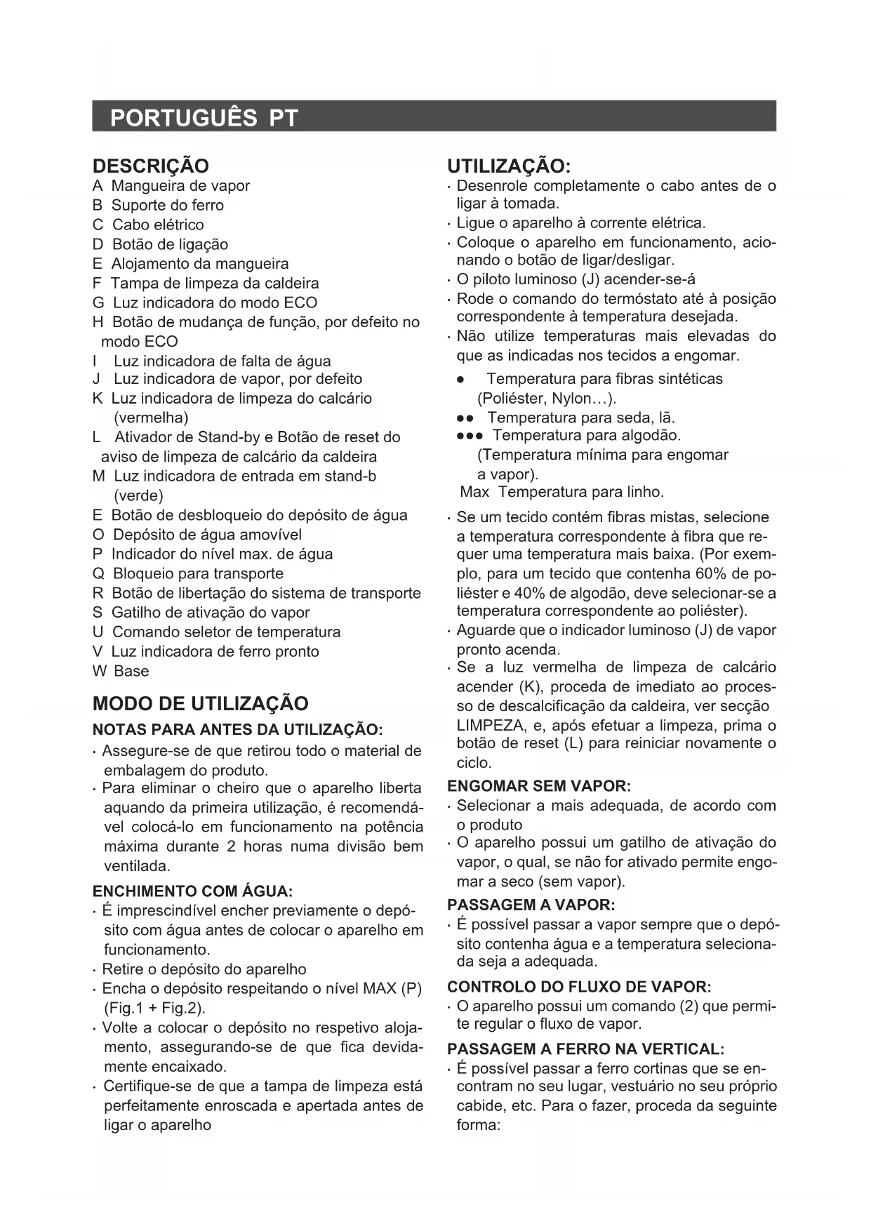 DESCRIÇÃO A Mangueira de vapor B Suporte do ferro C Cabo elétrico D Botão de ligação E Alojamento da mangueira F Tampa de limpeza da caldeira G Luz indicadora do modo ECO H Botão de mudança de função, por defeito no modo ECO I Luz indicadora de falta de água J Luz indicadora de vapor, por defeito K Luz indicadora de limpeza do calcário (vermelha) L Ativador de Stand-by e Botão de reset do aviso de limpeza de calcário da caldeira M Luz indicadora de entrada em stand-b (verde) E Botão de desbloqueio do depósito de água O Depósito de água amovível P Indicador do nível max. de água Q Bloqueio para transporte R Botão de libertação do sistema de transporte S Gatilho de ativação do vapor U Comando seletor de temperatura V Luz indicadora de ferro pronto W Base