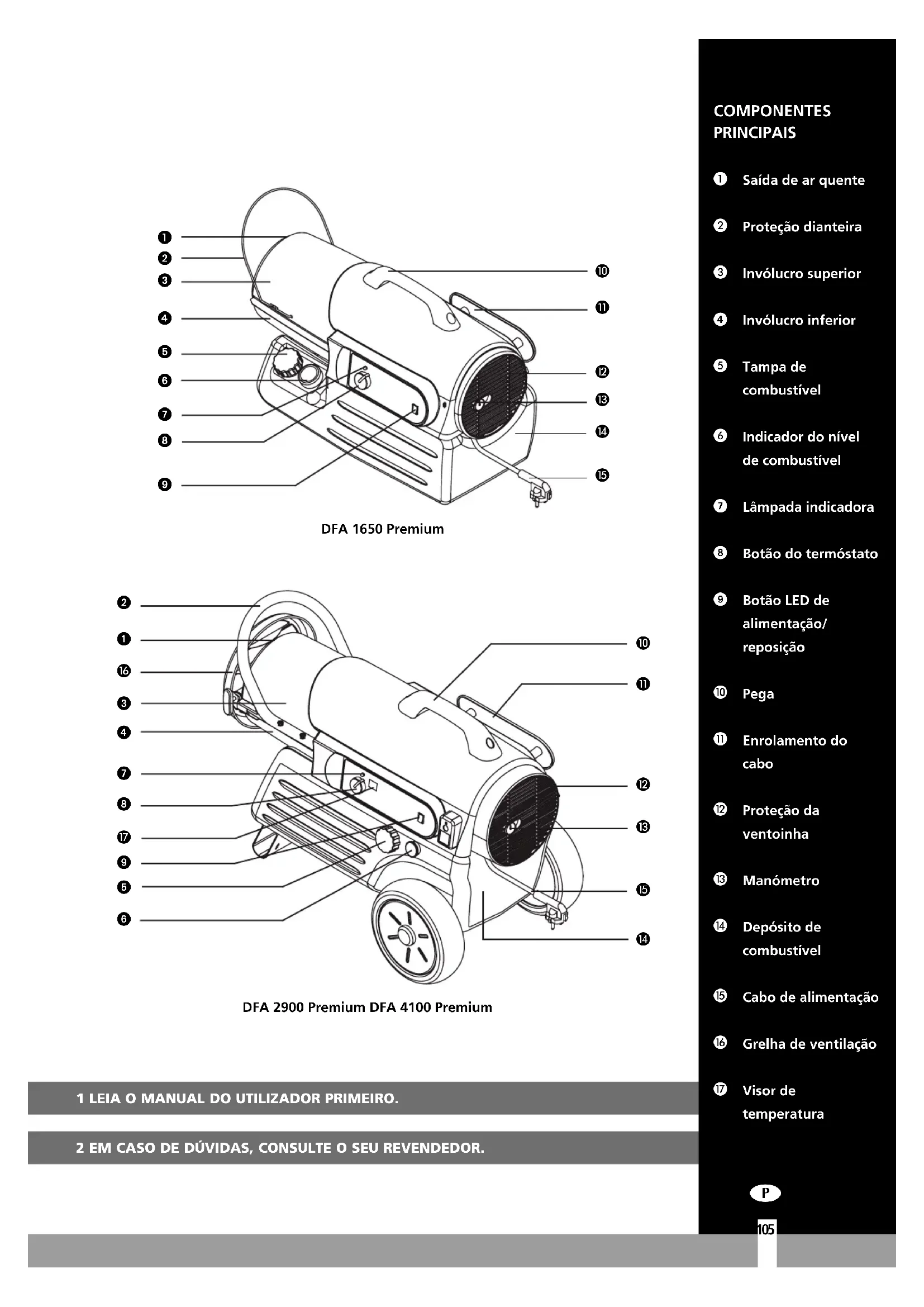 PVG Holding BV, Kanaalstraat 12 C, 5347 KM Oss, the Netherlands | P.O. Box 96, 5340 AB Oss, the Netherlands Qlima.com Made in Korea105 1 LEIA O MANUAL DO UTILIZADOR PRIMEIRO. 2 EM CASO DE DÚVIDAS, CONSULTE O SEU REVENDEDOR. COMPONENTES PRINCIPAIS Saída de ar quente Proteção dianteira Invólucro superior Invólucro inferior Tampa de combustível Indicador do nível de combustível Lâmpada indicadora Botão do termóstato Botão LED de alimentação/ reposição Pega Enrolamento do cabo Proteção da ventoinha Manómetro Depósito de combustível Cabo de alimentação Grelha de ventilação Visor de temperatura