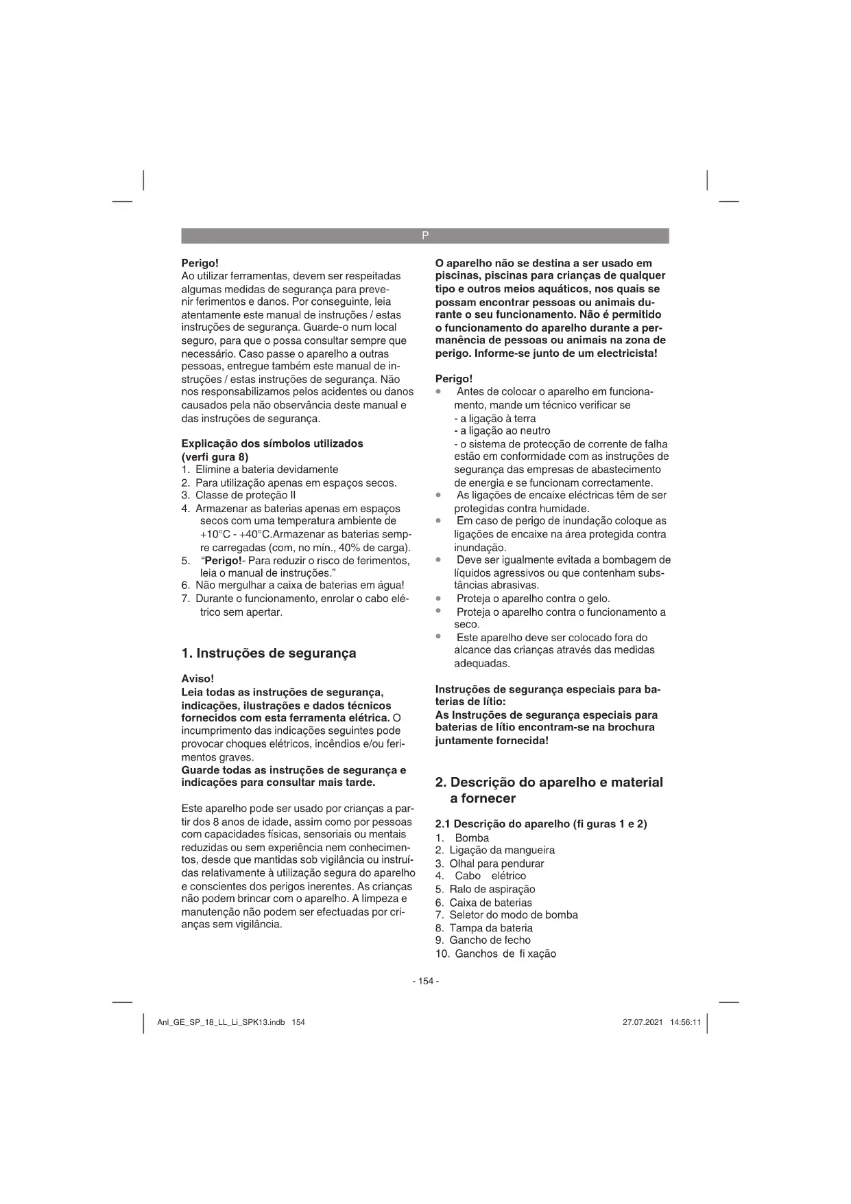 Aviso! Leia todas as instruções de segurança, indicações, ilustrações e dados técnicos fornecidos com esta ferramenta elétrica. O incumprimento das indicações seguintes pode provocar choques elétricos, incêndios e/ou feri- mentos graves. Guarde todas as instruções de segurança e indicações para consultar mais tarde. Este aparelho pode ser usado por crianças a par- tir dos 8 anos de idade, assim como por pessoas com capacidades físicas, sensoriais ou mentais reduzidas ou sem experiência nem conhecimen- tos, desde que mantidas sob vigilância ou instruí- das relativamente à utilização segura do aparelho e conscientes dos perigos inerentes. As crianças não podem brincar com o aparelho. A limpeza e manutenção não podem ser efectuadas por cri- anças sem vigilância. O aparelho não se destina a ser usado em piscinas, piscinas para crianças de qualquer tipo e outros meios aquáticos, nos quais se possam encontrar pessoas ou animais du- rante o seu funcionamento. Não é permitido o funcionamento do aparelho durante a per- manência de pessoas ou animais na zona de perigo. Informe-se junto de um electricista! Perigo!
