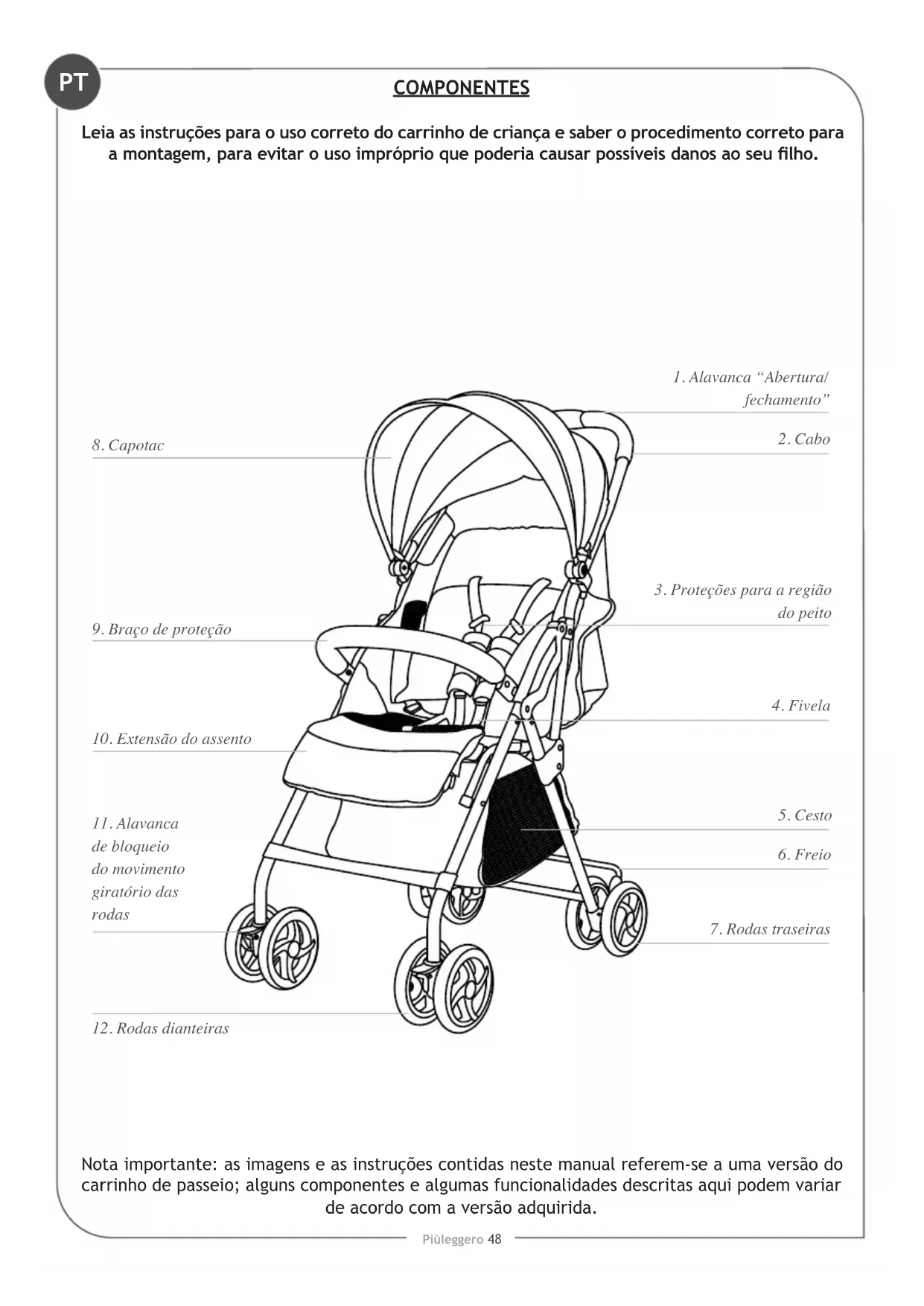 Nota importante: as imagens e as instruções contidas neste manual referem-se a uma versão do carrinho de passeio; alguns componentes e algumas funcionalidades descritas aqui podem variar de acordo com a versão adquirida.PT Piùleggero 49 MONTAGEM ABRA O CARRINHO DE PASSEIO (g.1) Desloque o botão “a” para a direita, como indicado na gura, e pressione simultaneamente o botão “b”. Levante a pega até a abertura completa da estrutura. Um ‘’clique’’ indica que o encaixe foi feito corretamente. Verique antes de usar se o carrinho de passeio está aberto corretamente e se os mecanismos estão corretamente bloqueados RODAS DIANTEIRAS (g.2) Montagem das rodas dianteiras: Levante a estrutura com uma mão e insira as rodas dianteiras, com a alavanca de bloqueio dirigida para cima no cubo da roda. O som do engate indicará que a operação foi efetuada corretamente. Controlar o engate correto em ambas as rodas e, se forem puxadas para baixo, não devem desengatar. Desmontagem das rodas dianteiras: pressione o dispositivo de bloqueio “a”, na parte inferior da roda e, mantendo-o pressionado, remover a roda do cubo. RODAS TRASEIRAS (g.3) Montagem das rodas traseiras: Insira o grupo das rodas posteriores na estrutura até que o mesmo seja engatado completamente. Verique se o suporte está engatado corretamente em ambos os lados da estrutura. O suporte das rodas está montado corretamente quando os pinos metálicos são boqueados nos furos dos tubos da estrutura. Desmontagem das rodas traseiras: Pressione o dispositivo de bloqueio, na parte inferior e, mantendo-o pressionado, remover o grupo das rodas posteriores. MONTAGEM DO COBRE-PERNAS (g.4) Montagem: Insira os grampos de plástico “a” nas respetivas guias situadas em ambos os lados do carrinho de passeio “b”. Um “clique” indica que o encaixe foi feito corretamente. Desmontagem: Puxar a alavanca “c” e levante para remover a capota. MONTAGEM DO BRAÇO DE PROTEÇÃO (g.5) Montagem: alinhe o braço com os próprios alojamentos, pressione em ambos os lados e o som de um “clique” indica que a operação de engate foi efetuada corretamente. Desmontagem: pressione o botão “a” de ambos os lados do braço e, contemporaneamente, puxe para removêlo. Abertura de um só lado: pressione o botão “a” de um lado do braço e puxe para abrílo em forma de livro. CESTO INFERIOR O cesto é xado na parte inferior da estrutura. Aconselha-se esvaziar o cesto antes de fechar o carrinho de bebé. UTILIZAÇÃO FREIO DE ESTACIONAMENTO (g.6) Acionar o freio: Pressione a alavanca do freio, empurre o carrinho levemente para a frente para vericar se o freio está acionado corretamente. Desativar o freio: Para desativar o freio, levante a alavanca “freio” como indicado na gura.PT Piùleggero 50 MONTAGEM REGULAÇÃO DO APOIO DOS PÉS (g.7) Pressione os botões “A” e regule o apoio dos pés na posição desejada. REGULAÇÃO DA CAPOTA (g.8) Estenda a capota, de acordo com suas próprias exigências, para proteger a criança dos raios solares. Atenção: A pele da criança é sensível, portanto, NUNCA deixe a criança exposta diretamente aos raios solares. Certique-se de que a capota esteja regulada corretamente. Abra o zíper, estenda a capota, de acordo com suas próprias exigências, para proteger a criança dos raios solares. ATIVAR O MOVIMENTO DAS RODAS GIRATÓRIAS DIANTEIRAS (g.9A) Como ilustrado na gura, pressionar ambas alavancas. BLOQUEAR O MOVIMENTO DAS RODAS GIRATÓRIAS DIANTEIRAS (g.9B) Como ilustrado na gura, levante a alavanca de ambas as rodas para bloqueá-las. CINTO DE SEGURANÇA (g.10-11) Acione o travão antes de colocar a criança. Desencaixe a vela: Pressione o botão “” e extraia os componentes. Coloque a criança no carrinho e regule o cinto de segurança de acordo com o tamanho da criança (g. 11). Encaixe a vela: Introduza a parte “a” na parte “b”, o som de um “clique” indicará que o engate foi feito corretamente. Utilize sempre os sistema de retenção corretamente enganchados. IMPORTANTE: Para crianças com menos de 6 meses de idade, os cintos da região peitoral devem ser inseridos nos passantes inferiores. REGULAÇÃO DO ENCOSTO (g.12) Como ilustrado na gura 12A, puxe a correia com uma mão e, com a outra, segure o dispositivo de regulação. Faça com que o dispositivo deslize na correia, para a parte anterior para levantar o encosto, ou para a parte posterior para recliná-lo. Libere o dispositivo de regulação para bloquear o encosto na posição escolhida. Aconselhamos efetuar a regulação do encosto sem a criança. IMPORTANTE: Para crianças com menos de 6 meses, o encosto deve ser regulado somente na posição mais reclinada possível, ou seja, na horizontal. FECHAMENTO DO CARRINHO (g.13) Antes de fechar o carrinho, certique-se de que: