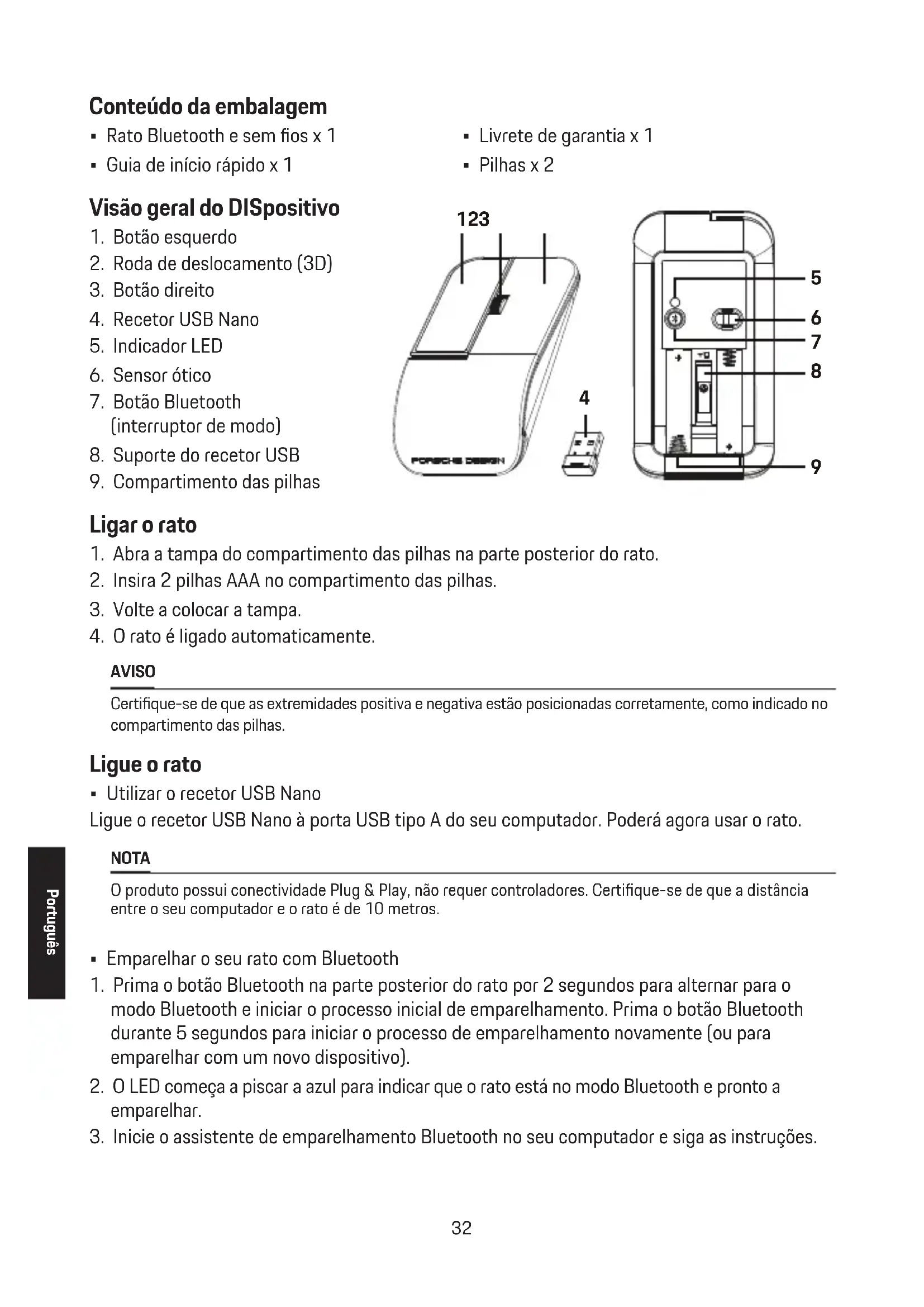 AVISO Certique-se de que as extremidades positiva e negativa estão posicionadas corretamente, como indicado no compartimento das pilhas. Ligue o rato
