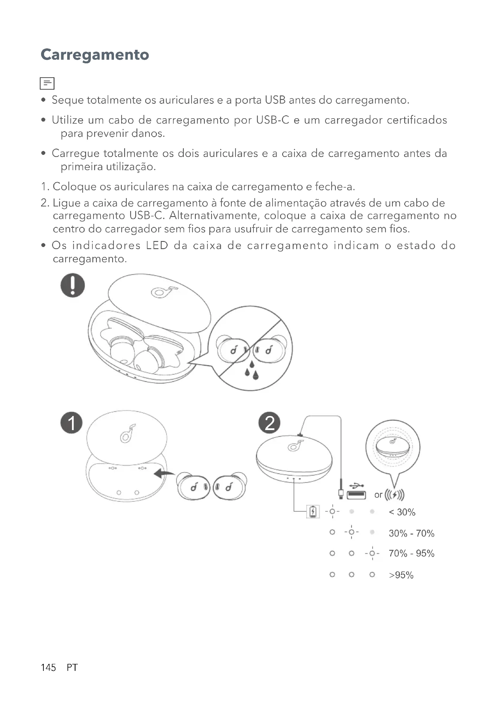 - Os LEDs indicadores no estojo carregador mostram o status do carregamento. < 30% 30% - 70% 70% - 95% >95%