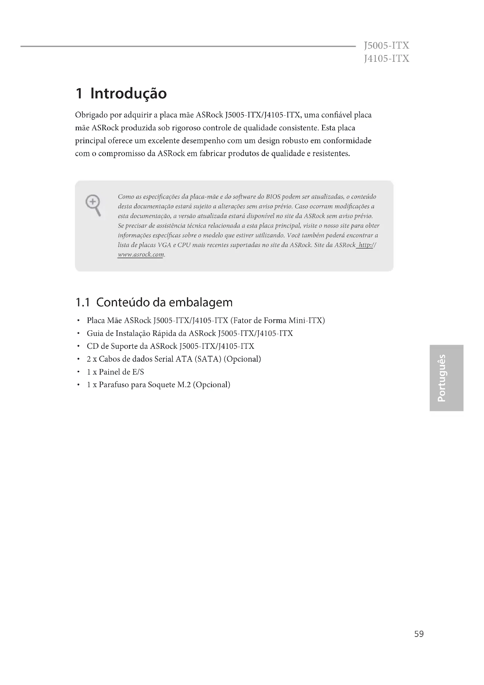 AN_VOLTAGE59 J5005-ITX J4105-ITX Português 1 Introdução Obrigado por adquirir a placa mãe ASRock J5005-ITX/J4105-ITX, uma conável placa mãe ASRock produzida sob rigoroso controle de qualidade consistente. Esta placa principal oferece um excelente desempenho com um design robusto em conformidade com o compromisso da ASRock em fabricar produtos de qualidade e resistentes.
