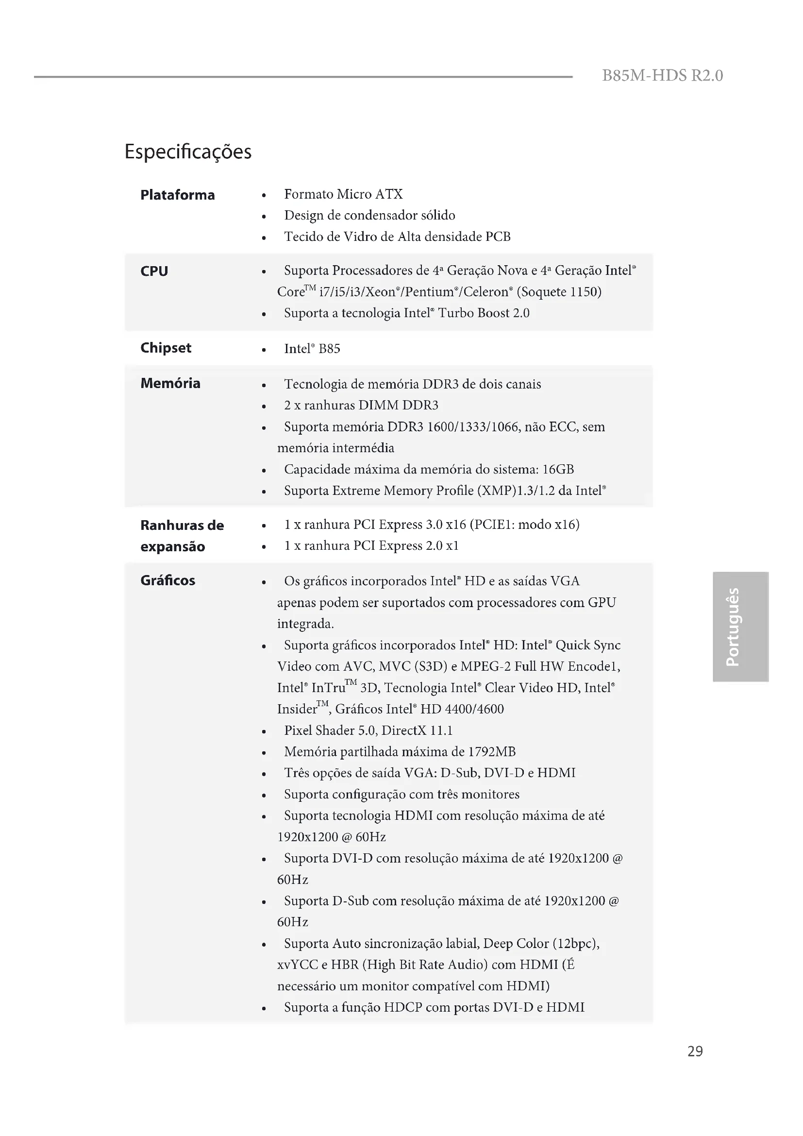 Encontre gratuitamente o manual do aparelho B85MHDS R2.0 ASROCK em formato PDF.