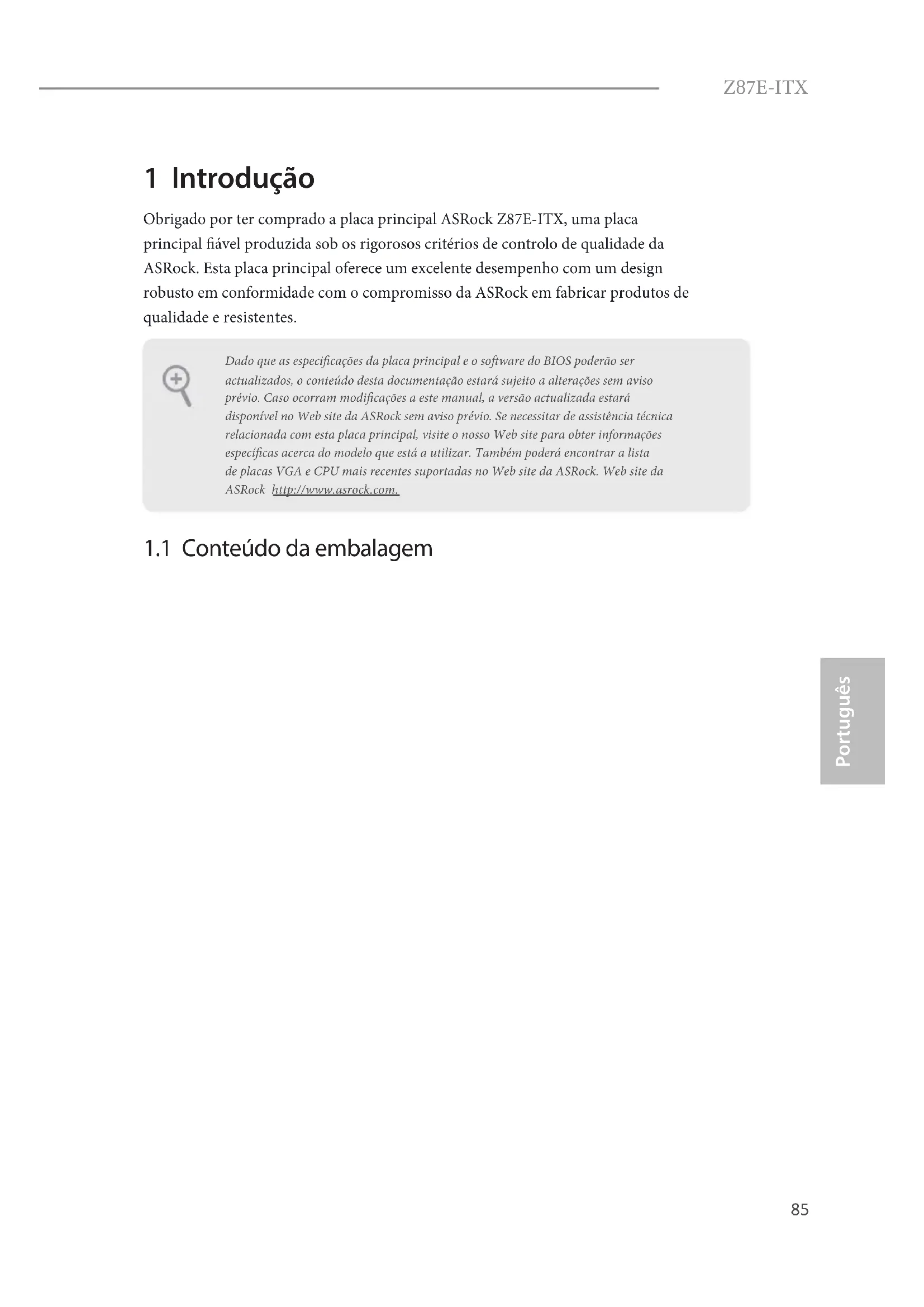 Português 1 Introdução Obrigado por ter comprado a placa principal ASRock Z87E-ITX, uma placa principal ável produzida sob os rigorosos critérios de controlo de qualidade da ASRock. Esta placa principal oferece um excelente desempenho com um design robusto em conformidade com o compromisso da ASRock em fabricar produtos de qualidade e resistentes.