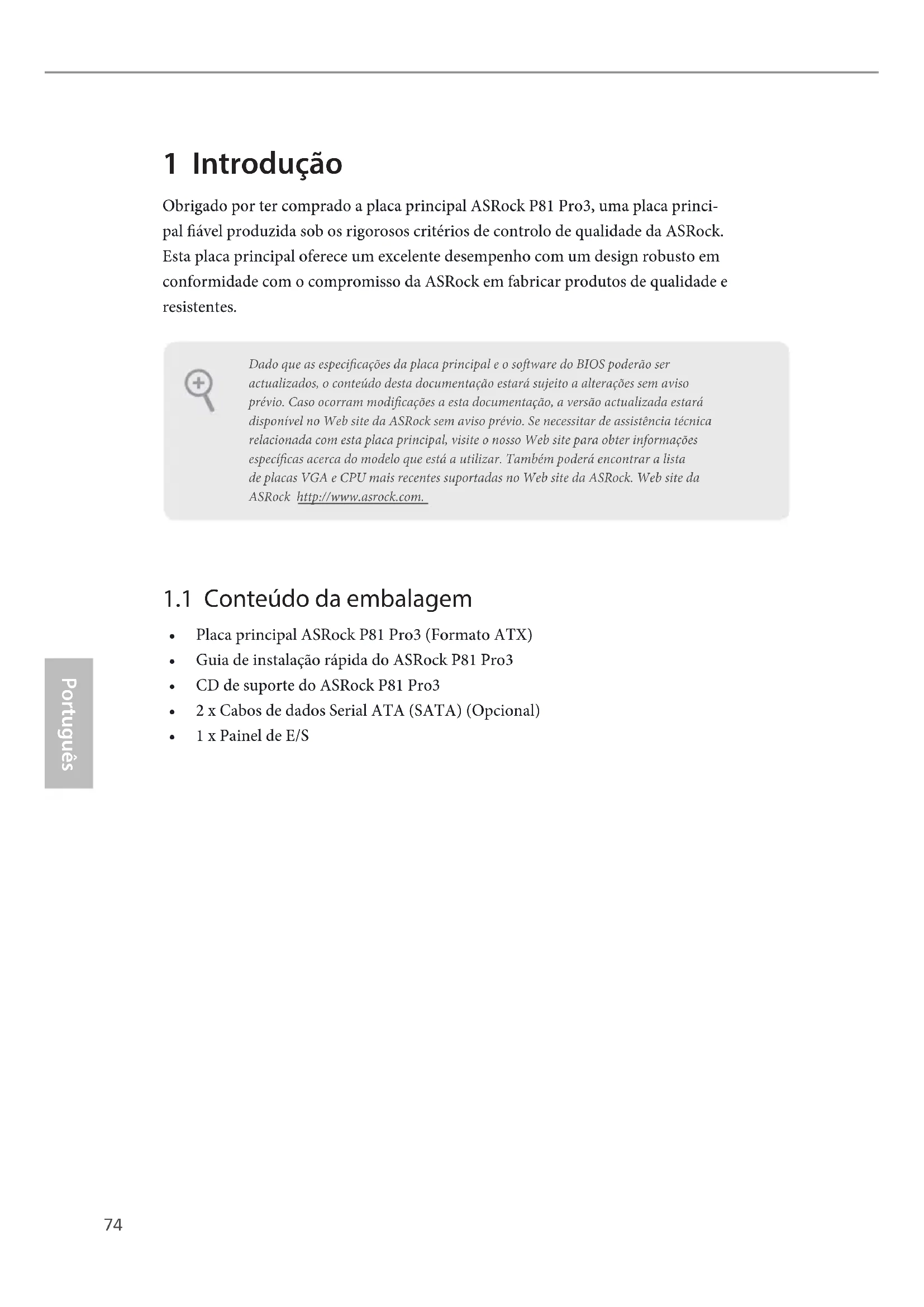 - 1 x Painel de E/S Dado que as especicações da placa principal e o soware do BIOS poderão ser actualizados, o conteúdo desta documentação estará sujeito a alterações sem aviso prévio. Caso ocorram modicações a esta documentação, a versão actualizada estará disponível no Web site da ASRock sem aviso prévio. Se necessitar de assistência técnica relacionada com esta placa principal, visite o nosso Web site para obter informações especícas acerca do modelo que está a utilizar. Também poderá encontrar a lista de placas VGA e CPU mais recentes suportadas no Web site da ASRock. Web site da ASRock http://www.asrock.com.P81 Pro3