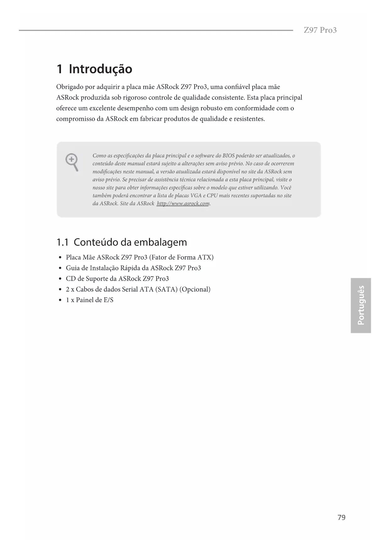 Português 1 Introdução Obrigado por adquirir a placa mãe ASRock Z97 Pro3, uma conável placa mãe ASRock produzida sob rigoroso controle de qualidade consistente. Esta placa principal oferece um excelente desempenho com um design robusto em conformidade com o compromisso da ASRock em fabricar produtos de qualidade e resistentes.