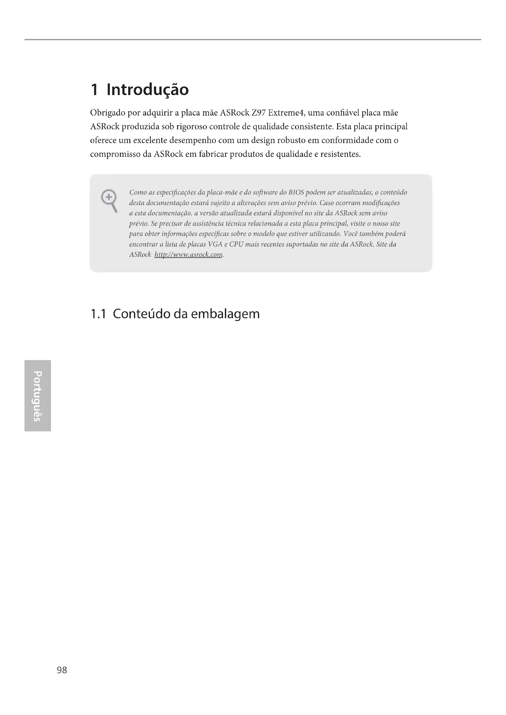 - 1 x Parafuso para M. 2_SSD (NGFF) Soquete 3 Como as especicações da placa-mãe e do soware do BIOS podem ser atualizadas, o conteúdo desta documentação estará sujeito a alterações sem aviso prévio. Caso ocorram modicações a esta documentação, a versão atualizada estará disponível no site da ASRock sem aviso prévio. Se precisar de assistência técnica relacionada a esta placa principal, visite o nosso site para obter informações especícas sobre o modelo que estiver utilizando. Você também poderá encontrar a lista de placas VGA e CPU mais recentes suportadas no site da ASRock. Site da ASRock http://www.asrock.com.99 Português Z97 Extreme4