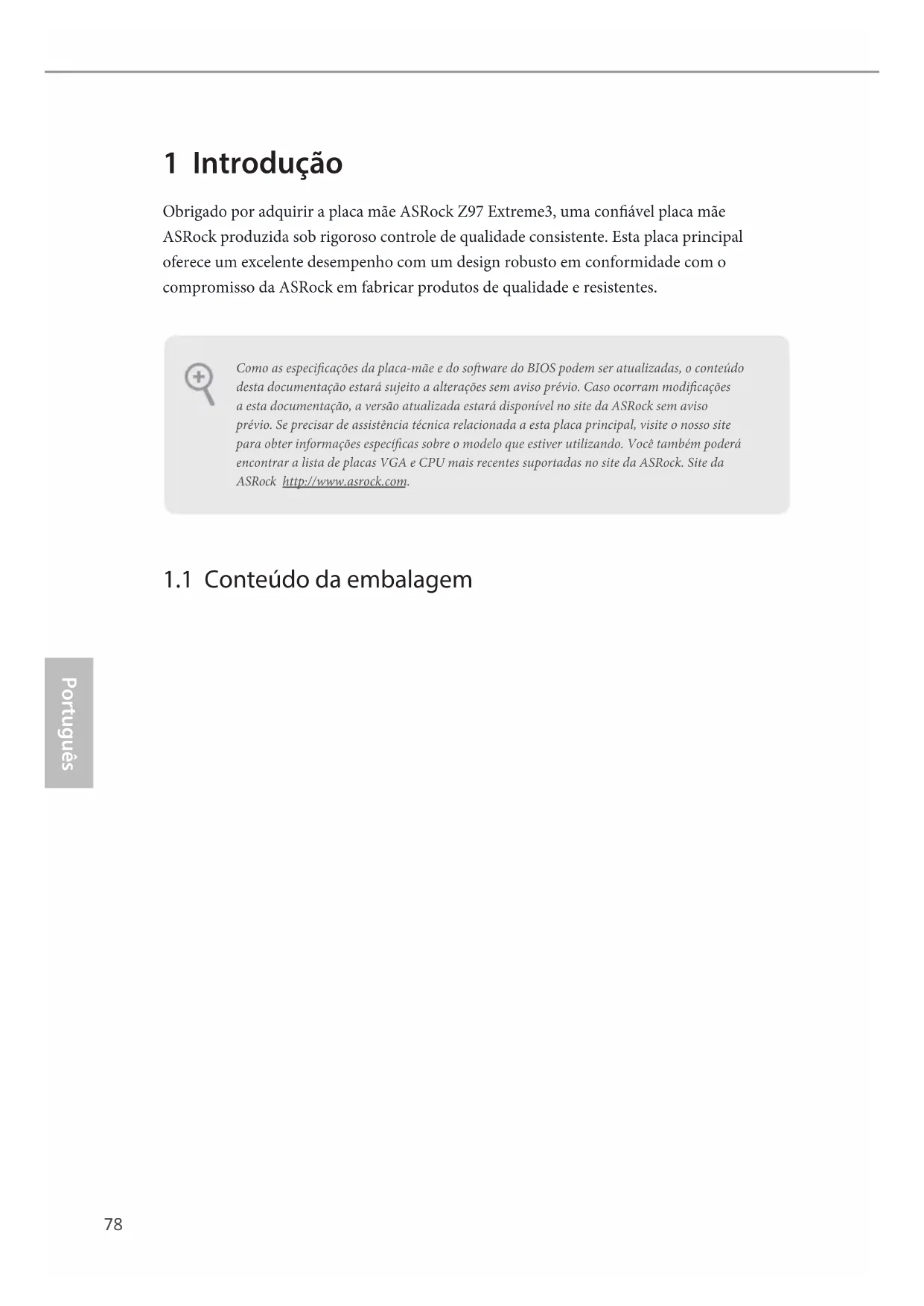 - 1 x Placa Bridge_SLI_2S ASRock Como as especicações da placa-mãe e do soware do BIOS podem ser atualizadas, o conteúdo desta documentação estará sujeito a alterações sem aviso prévio. Caso ocorram modicações a esta documentação, a versão atualizada estará disponível no site da ASRock sem aviso prévio. Se precisar de assistência técnica relacionada a esta placa principal, visite o nosso site para obter informações especícas sobre o modelo que estiver utilizando. Você também poderá encontrar a lista de placas VGA e CPU mais recentes suportadas no site da ASRock. Site da ASRock http://www.asrock.com.79 Português Z97 Extreme3