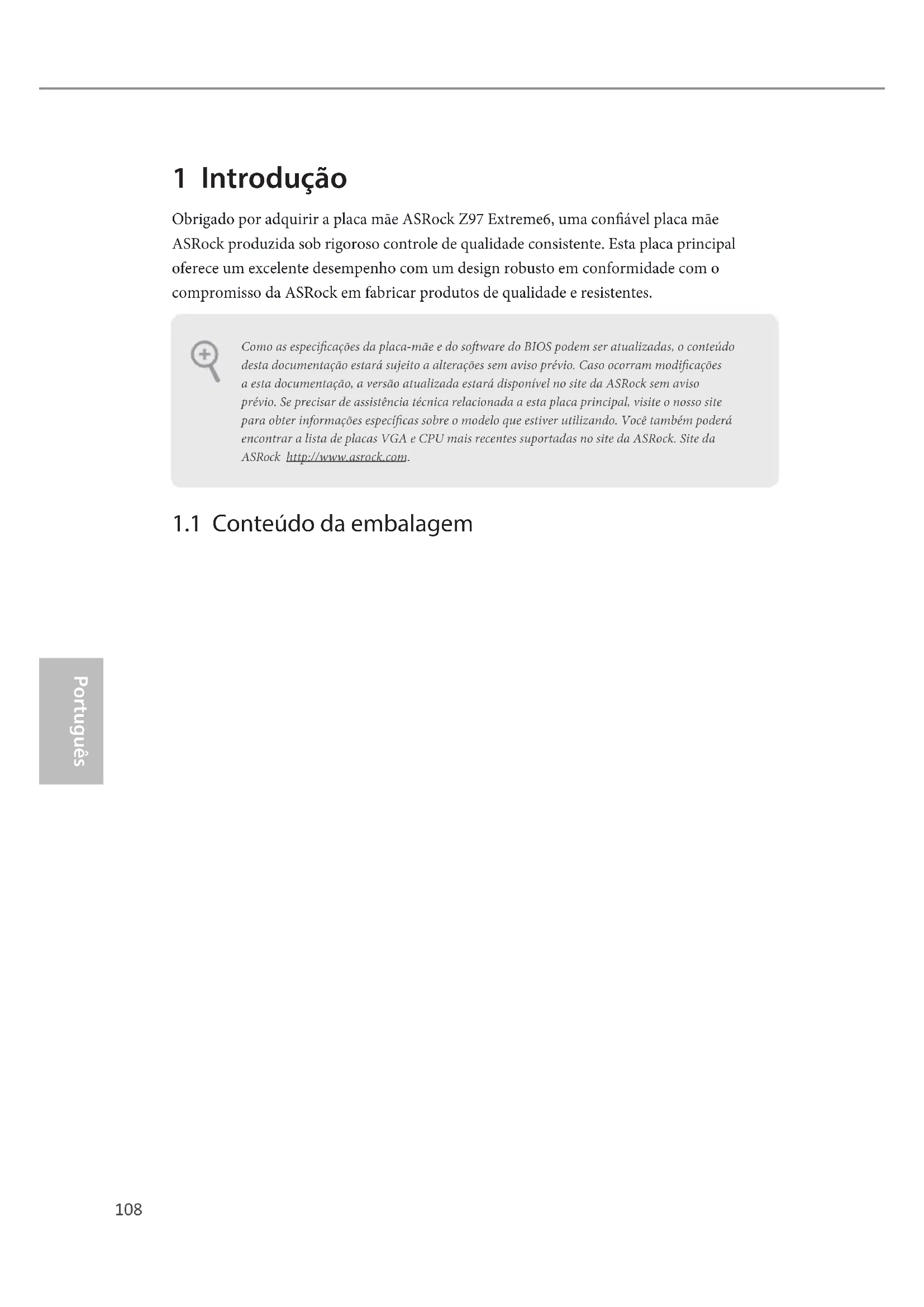 - 1 x Parafusos para Slot mini-PCIe Como as especicações da placa-mãe e do soware do BIOS podem ser atualizadas, o conteúdo desta documentação estará sujeito a alterações sem aviso prévio. Caso ocorram modicações a esta documentação, a versão atualizada estará disponível no site da ASRock sem aviso prévio. Se precisar de assistência técnica relacionada a esta placa principal, visite o nosso site para obter informações especícas sobre o modelo que estiver utilizando. Você também poderá encontrar a lista de placas VGA e CPU mais recentes suportadas no site da ASRock. Site da ASRock http://www.asrock.com.109 Z97 Extreme6 Português