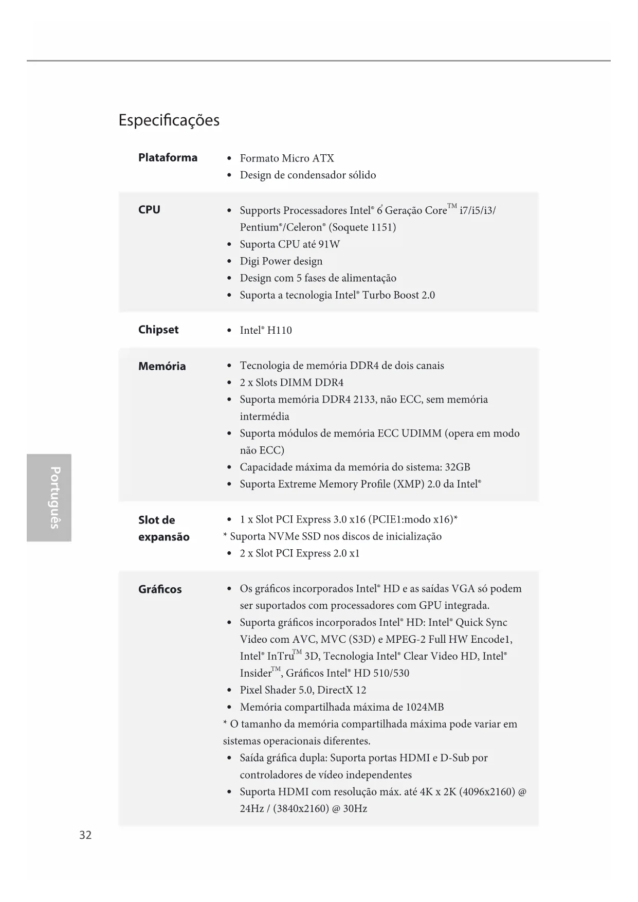 Suporta HDMI com resolução máx. até 4K x 2K (4096x2160) @ 24Hz / (3840x2160) @ 30Hz33 Português H110M-HG4
