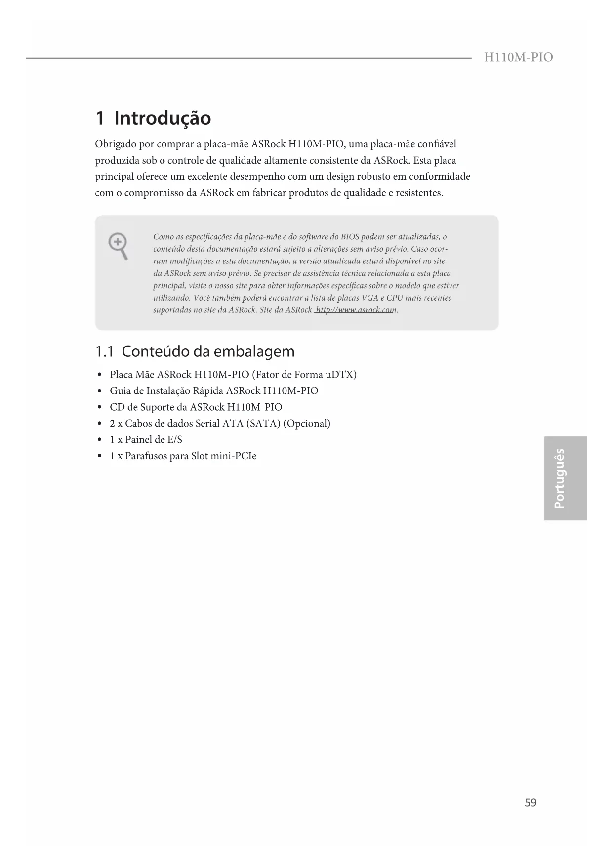 1 x Parafusos para Slot mini-PCIe Como as especicações da placa-mãe e do soware do BIOS podem ser atualizadas, o conteúdo desta documentação estará sujeito a alterações sem aviso prévio. Caso ocor-ram modicações a esta documentação, a versão atualizada estará disponível no site da ASRock sem aviso prévio. Se precisar de assistência técnica relacionada a esta placa principal, visite o nosso site para obter informações especícas sobre o modelo que estiver utilizando. Você também poderá encontrar a lista de placas VGA e CPU mais recentes suportadas no site da ASRock. Site da ASRock http://www.asrock.com.60 Português