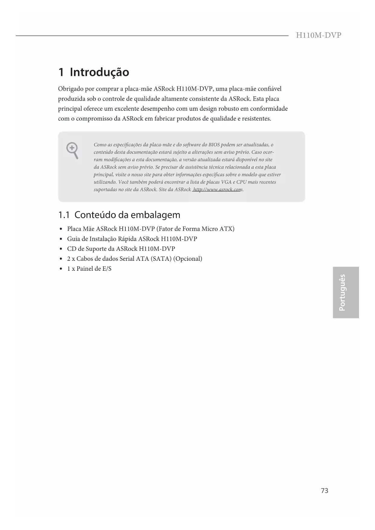 1 x Painel de E/S Como as especicações da placa-mãe e do soware do BIOS podem ser atualizadas, o conteúdo desta documentação estará sujeito a alterações sem aviso prévio. Caso ocor-ram modicações a esta documentação, a versão atualizada estará disponível no site da ASRock sem aviso prévio. Se precisar de assistência técnica relacionada a esta placa principal, visite o nosso site para obter informações especícas sobre o modelo que estiver utilizando. Você também poderá encontrar a lista de placas VGA e CPU mais recentes suportadas no site da ASRock. Site da ASRock http://www.asrock.com.74 Português