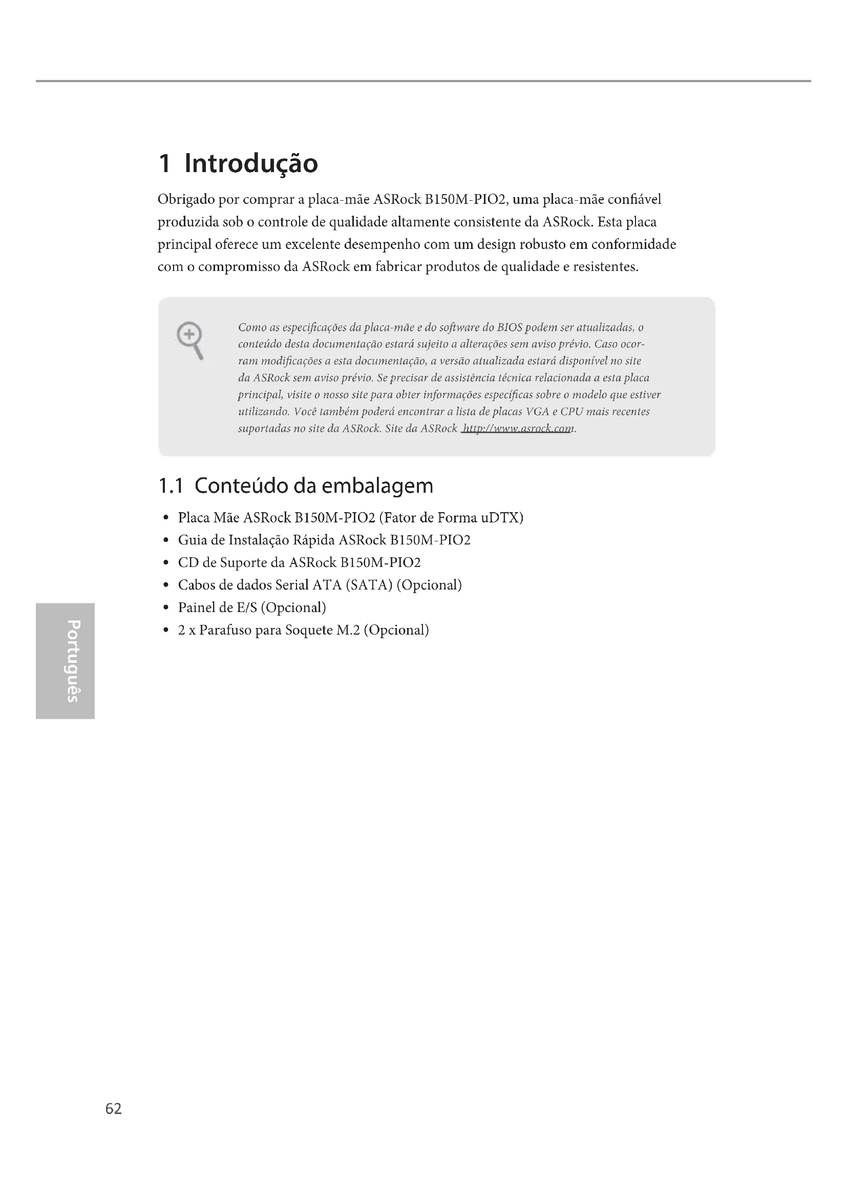2 x Parafuso para Soquete M.2 (Opcional) Como as especicações da placa-mãe e do soware do BIOS podem ser atualizadas, o conteúdo desta documentação estará sujeito a alterações sem aviso prévio. Caso ocor-ram modicações a esta documentação, a versão atualizada estará disponível no site da ASRock sem aviso prévio. Se precisar de assistência técnica relacionada a esta placa principal, visite o nosso site para obter informações especícas sobre o modelo que estiver utilizando. Você também poderá encontrar a lista de placas VGA e CPU mais recentes suportadas no site da ASRock. Site da ASRock http://www.asrock.com.63 Português B150M-PIO2