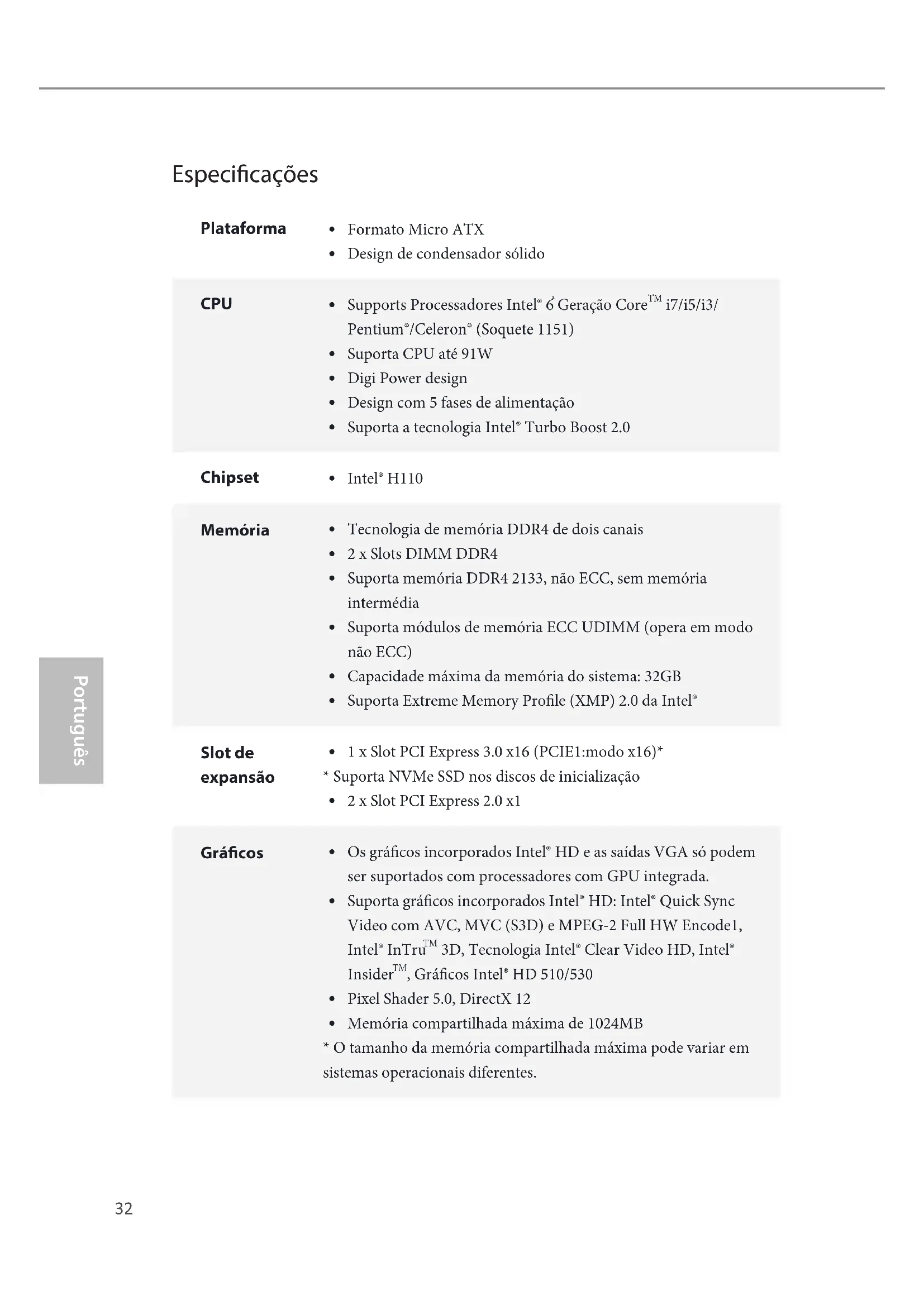 Os grácos incorporados Intel® HD e as saídas VGA só podem ser suportados com processadores com GPU integrada.