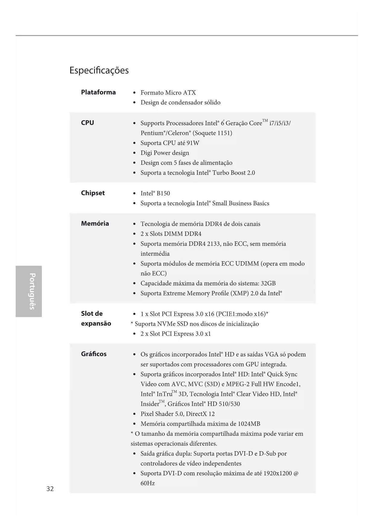 Os grácos incorporados Intel® HD e as saídas VGA só podem ser suportados com processadores com GPU integrada.