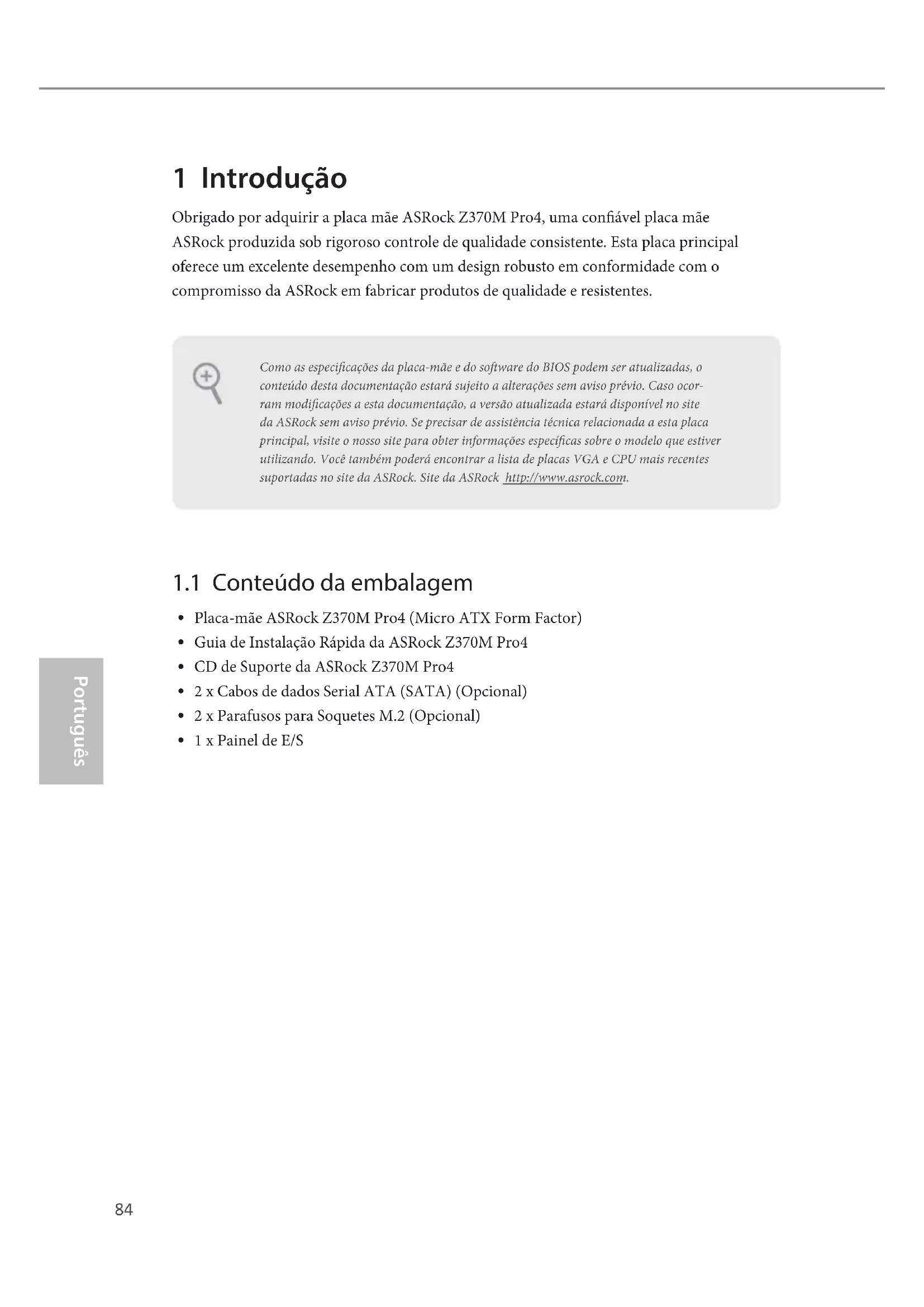 1 x Painel de E/S Como as especicações da placa-mãe e do soware do BIOS podem ser atualizadas, o conteúdo desta documentação estará sujeito a alterações sem aviso prévio. Caso ocor-ram modicações a esta documentação, a versão atualizada estará disponível no site da ASRock sem aviso prévio. Se precisar de assistência técnica relacionada a esta placa principal, visite o nosso site para obter informações especícas sobre o modelo que estiver utilizando. Você também poderá encontrar a lista de placas VGA e CPU mais recentes suportadas no site da ASRock. Site da ASRock http://www.asrock.com.85 Z370M Pro4 Português