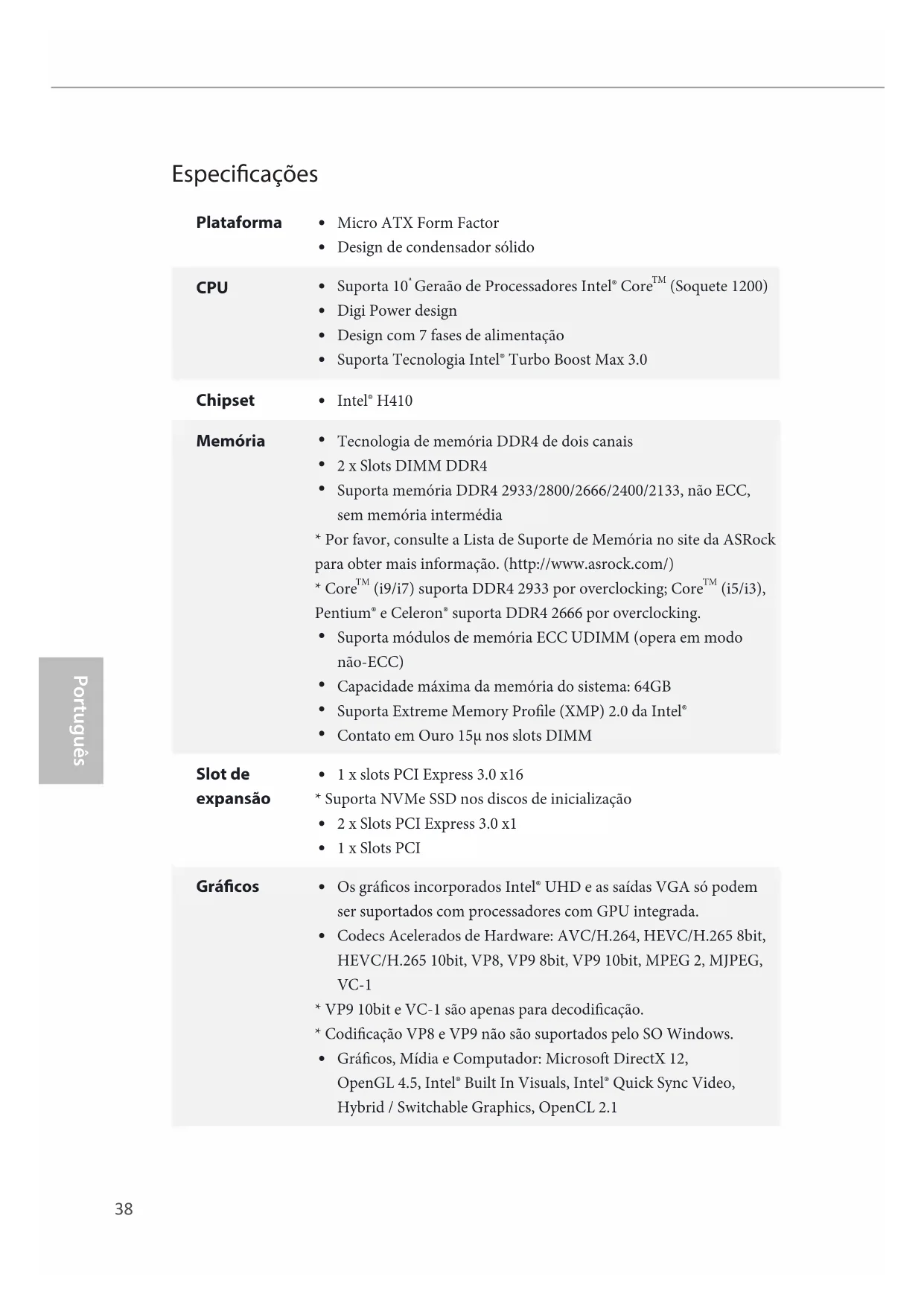 Microso® Windows® 10 (64-разрядная)38 Português Especicações Plataforma