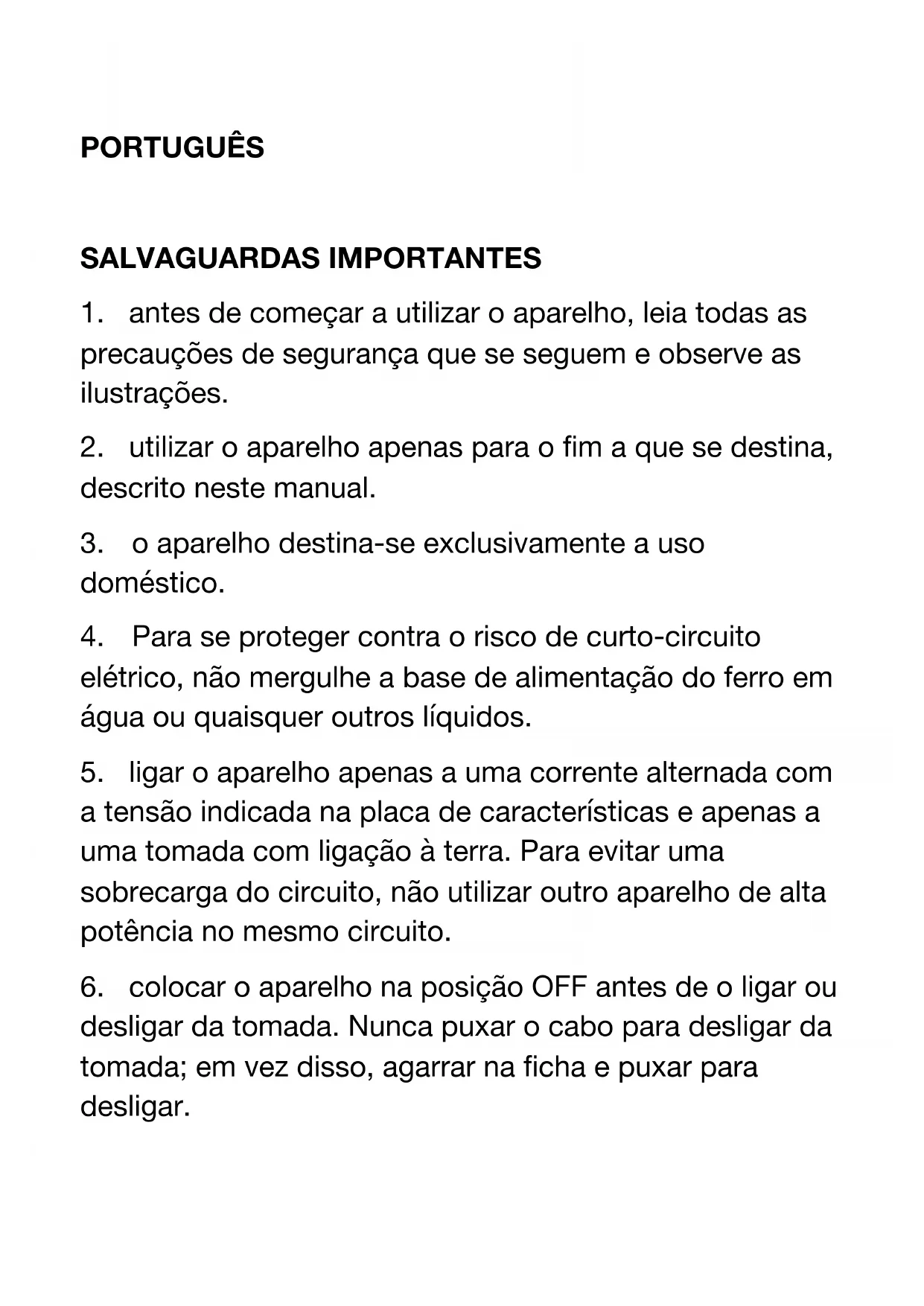 o aparelho tiver caído ou estiver danificado. Para evitar qualquer perigo, como o risco de choque elétrico, não desmonte o aparelho; este deve ser levado a um técnico qualificado ou ao fabricante ou ao seu agente de assistência para ser examinado e reparado. Uma montagem incorrecta pode provocar um risco de choque elétrico quando o ferro é utilizado.