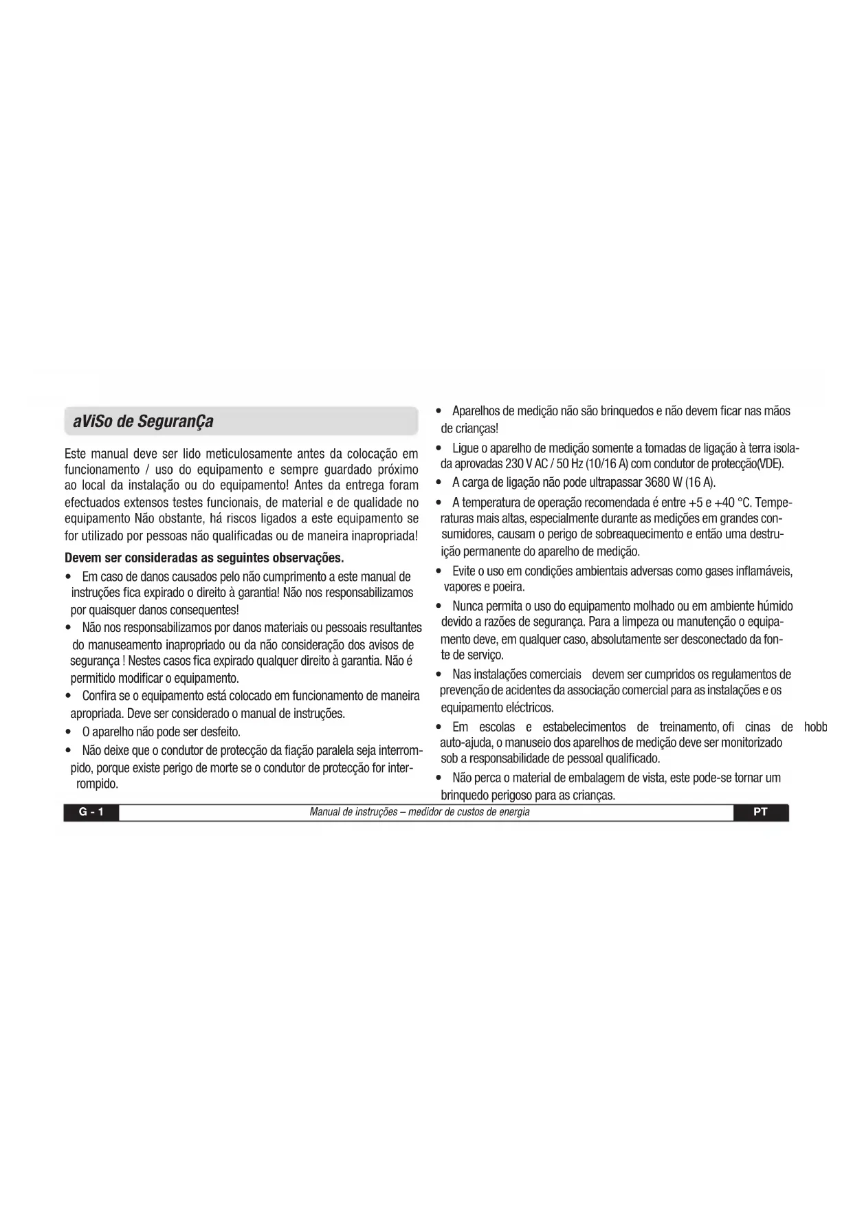 - Nãopercaomaterialdeembalagemdevista,estepode-setornarum brinquedo perigoso para as crianças.PT Manual de instruções – medidor de custos de energia G - 2