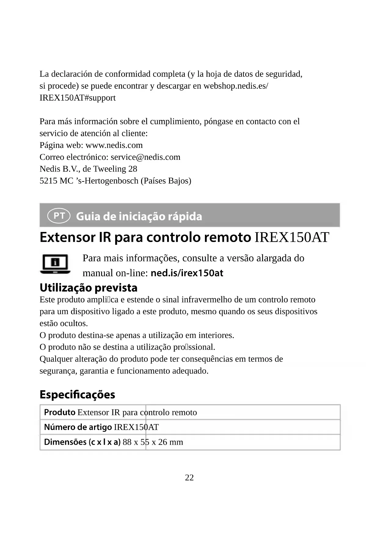 , produzido na China, foi testado em conformidade com todas as normas e regulamentos CE relevantes e que todos os testes foram concluídos com sucesso. Os mesmos incluem, entre outros, o regulamento RED 2014/53/UE. A Declaração de conformidade (e a cha de dados de segurança, se aplicável) pode ser consultada e descarregada em webshop.nedis.pt/IREX150AT#support Para informações adicionais relativas à conformidade, contacte a assistência ao cliente: Site: www.nedis.com E-mail: service@nedis.com Nedis B.V., de Tweeling 28 5215 MC ’s-Hertogenbosch, Países Baixos