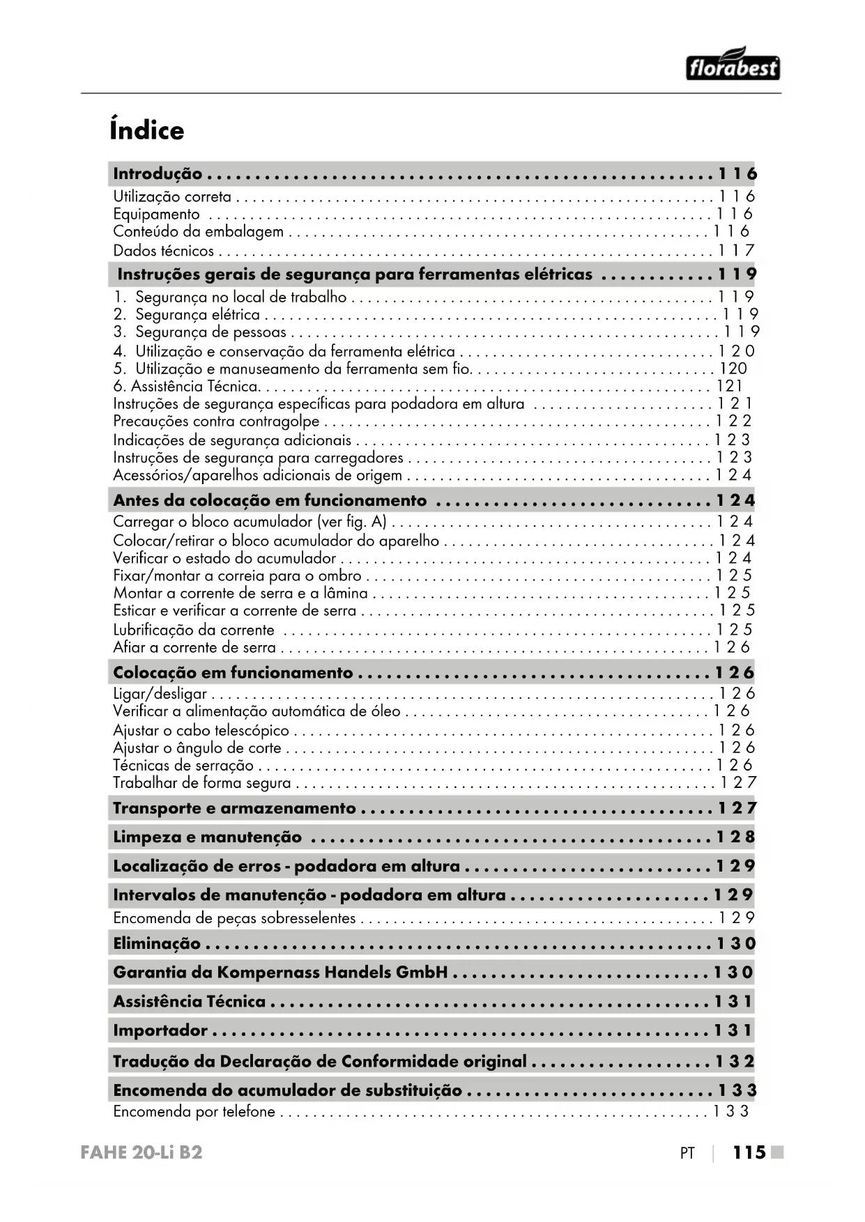EN 55014-1:2006/A2:2011 EN 55014-2:2015 EN 60335-1:2012/A11:2014 EN 60335-2-29: 2004/A2:2010 EN 62233:2008 EN 61000-3-2: 2014 EN 61000-3-3:2013 EN 50581:2012 Tipo/designação do aparelho: Serra telescópica com bateria FAHE 20-Li B2 Ano de fabrico: 01 - 2018 N.º de encomenda: IAN 300034 Bochum, 08.02.2018 Semi Uguzlu - Gestor de qualidade - Reservado o direito a alterações técnicas no âmbito do desenvolvimento.FAHE 20-Li B2 PT │ 133 ■ Encomenda do acumulador de substituição Se pretender encomendar um acumulador de substituição para o seu aparelho, pode fazê-lo comoda- mente via internet, em www.kompernass.com, ou pelo telefone. O preço do acumulador de substituição é 25,00 €, incl. IVA e envio. Como os stocks são limitados, este artigo pode-se esgotar rapidamente. NOTA ► Em alguns países pode não ser possível efetuar a encomenda de peças sobresselentes online. Neste caso, contacte a linha direta de Assistência Técnica. ■ A promoção é limitada a um acumulador por cliente/aparelho, bem como a um período de dois meses após o período da promoção. Após este período, o acumulador de substituição pode ser encomendado como peça sobresselente noutras condições. Encomenda por telefone Assistência Portugal Tel.: 70778 0005 (0,12 EUR/Min.) E-Mail: kompernass@lidl.pt Para garantir um rápido processamento da sua encomenda, tenha o número de artigo (p. ex. IAN 300034) do aparelho disponível para eventuais questões. O número de artigo pode ser consultado na placa de características ou na folha de rosto deste manual.FAHE 20-Li B2 ■ 134 │ PT8 IAN 300034