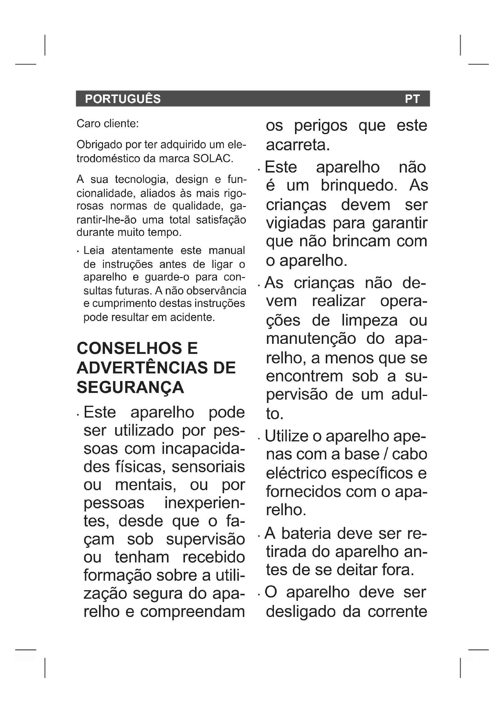 Caro cliente: Obrigado por ter adquirido um ele- trodoméstico da marca SOLAC. A sua tecnologia, design e fun- cionalidade, aliados às mais rigo- rosas normas de qualidade, ga- rantir-lhe-ão uma total satisfação durante muito tempo.