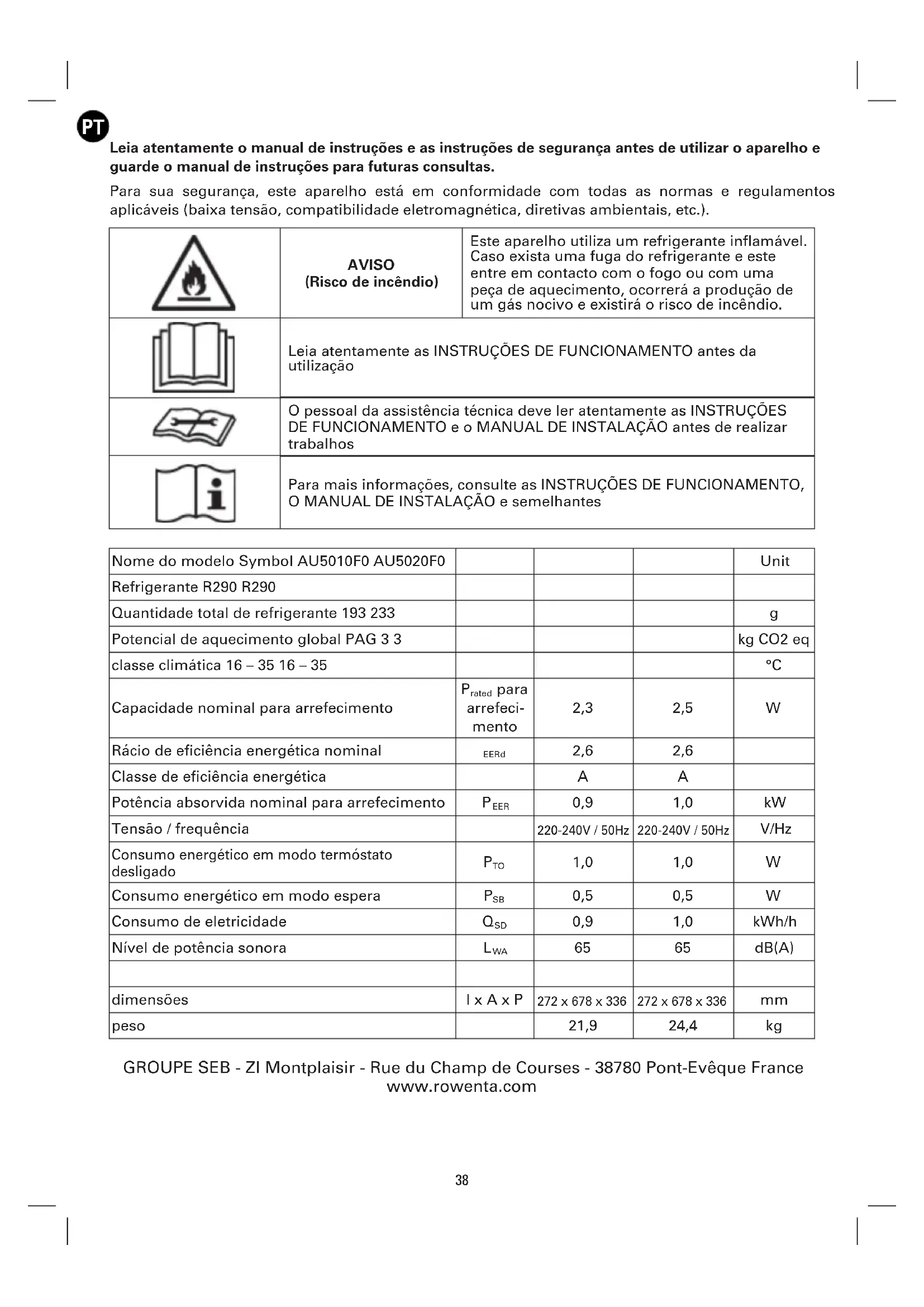 Leia atentamente o manual de instruções e as instruções de segurança antes de utilizar o aparelho e guarde o manual de instruções para futuras consultas. Para sua segurança, este aparelho está em conformidade com todas as normas e regulamentos aplicáveis (baixa tensão, compatibilidade eletromagnética, diretivas ambientais, etc.). AVISO (Risco de incêndio) Este aparelho utiliza um refrigerante inflamável. Caso exista uma fuga do refrigerante e este entre em contacto com o fogo ou com uma peça de aquecimento, ocorrerá a produção de um gás nocivo e existirá o risco de incêndio. Leia atentamente as INSTRUÇÕES DE FUNCIONAMENTO antes da utilização O pessoal da assistência técnica deve ler atentamente as INSTRUÇÕES DE FUNCIONAMENTO e o MANUAL DE INSTALAÇÃO antes de realizar trabalhos Para mais informações, consulte as INSTRUÇÕES DE FUNCIONAMENTO, O MANUAL DE INSTALAÇÃO e semelhantes Nome do modelo Symbol AU5010F0 AU5020F0 Unit Refrigerante R290 R290 Quantidade total de refrigerante 193 233
