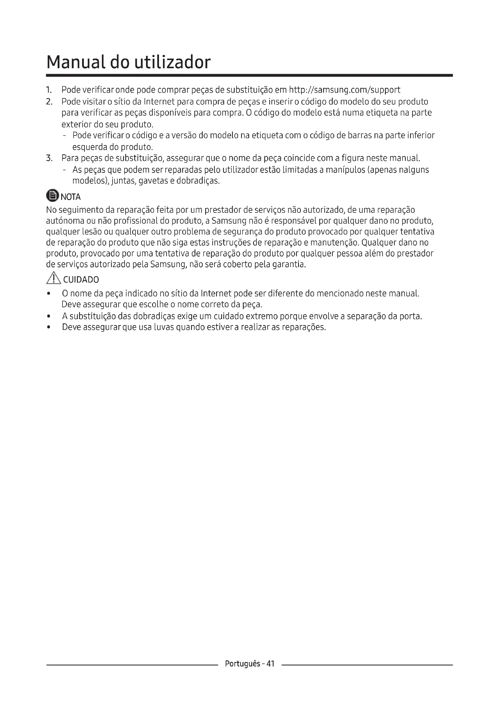 ‐ As peças que podem ser reparadas pelo utilizador estão limitadas a manípulos (apenas nalguns modelos), juntas, gavetas e dobradiças. NOTA No seguimento da reparação feita por um prestador de serviços não autorizado, de uma reparação autónoma ou não profissional do produto, a Samsung não é responsável por qualquer dano no produto, qualquer lesão ou qualquer outro problema de segurança do produto provocado por qualquer tentativa de reparação do produto que não siga estas instruções de reparação e manutenção. Qualquer dano no produto, provocado por uma tentativa de reparação do produto por qualquer pessoa além do prestador de serviços autorizado pela Samsung, não será coberto pela garantia. CUIDADO