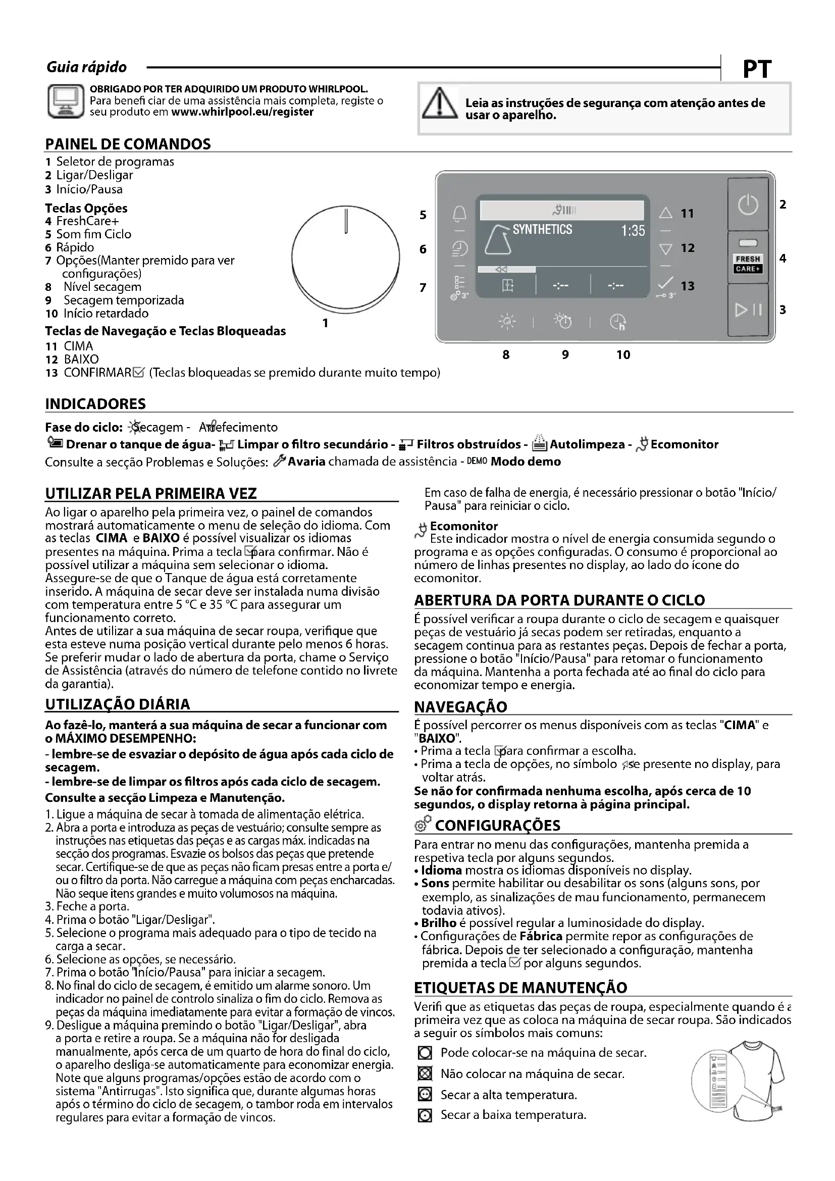 Verifi que as etiquetas das peças de roupa, especialmente quando é a primeira vez que as coloca na máquina de secar roupa. São indicados a seguir os símbolos mais comuns: Pode colocar-se na máquina de secar. Não colocar na máquina de secar. Secar a alta temperatura. Secar a baixa temperatura. INDICADORES Fase do ciclo: Secagem - Arrefecimento Drenar o tanque de água- Limpar o ltro secundário - Filtros obstruídos - Autolimpeza - Ecomonitor Consulte a secção Problemas e Soluções: Avaria chamada de assistência - DEMO Modo demo