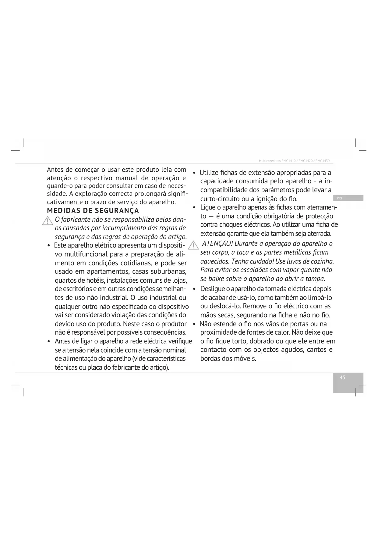 É proibida a reparação não qualicada do apa- relho ou a introdução de alterações na sua construção. Todos os trabalhos de manutenção e reparação devem ser efectuados por um cen- tro de serviço autorizado. Os trabalhos não qualicados podem causar avaria do aparelho, traumatismos e danos materiais.47 PRT Multicozeduras RMC-M10 / RMC-M20 / RMC-M30 CONTEÚDO