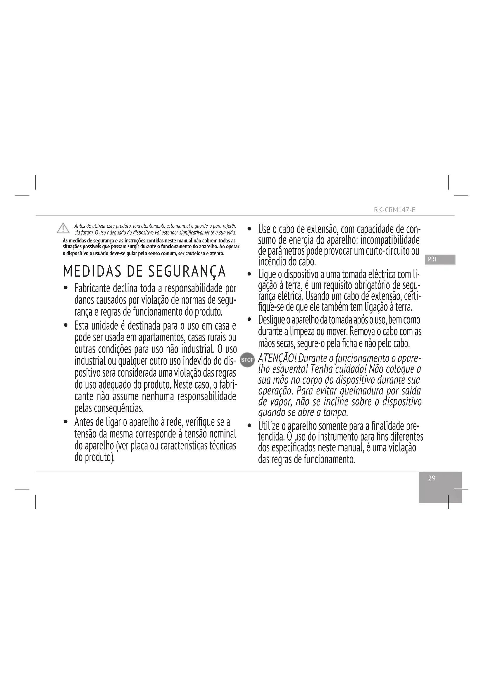 São proibidos independente de reparação do dis- positivo ou alterações em sua estrutura. Conserto do aparelho deve ser feita exclusivamente por um técnico autorizado do centro de serviço. Prossio- nal feito o trabalho pode causar danos no aparelho, ferimentos e danos à propriedade. ATENÇÃO! Este aparelho quando todas as avarias. Especicacao Modelo .........................................................................................................................RK-CBM147-E Poder.............................................................................................................................1850-2200 W Tensao .............................................................................................................220-240 V, 50/60 Hz Segurança eléctrica ..............................................................................................................classe I Capacidade....................................................................................................................................1,7 l Material corporal .........................................................................................................................inox Filtro de descalque .......................................................................................................... removivel Interrupção automática: