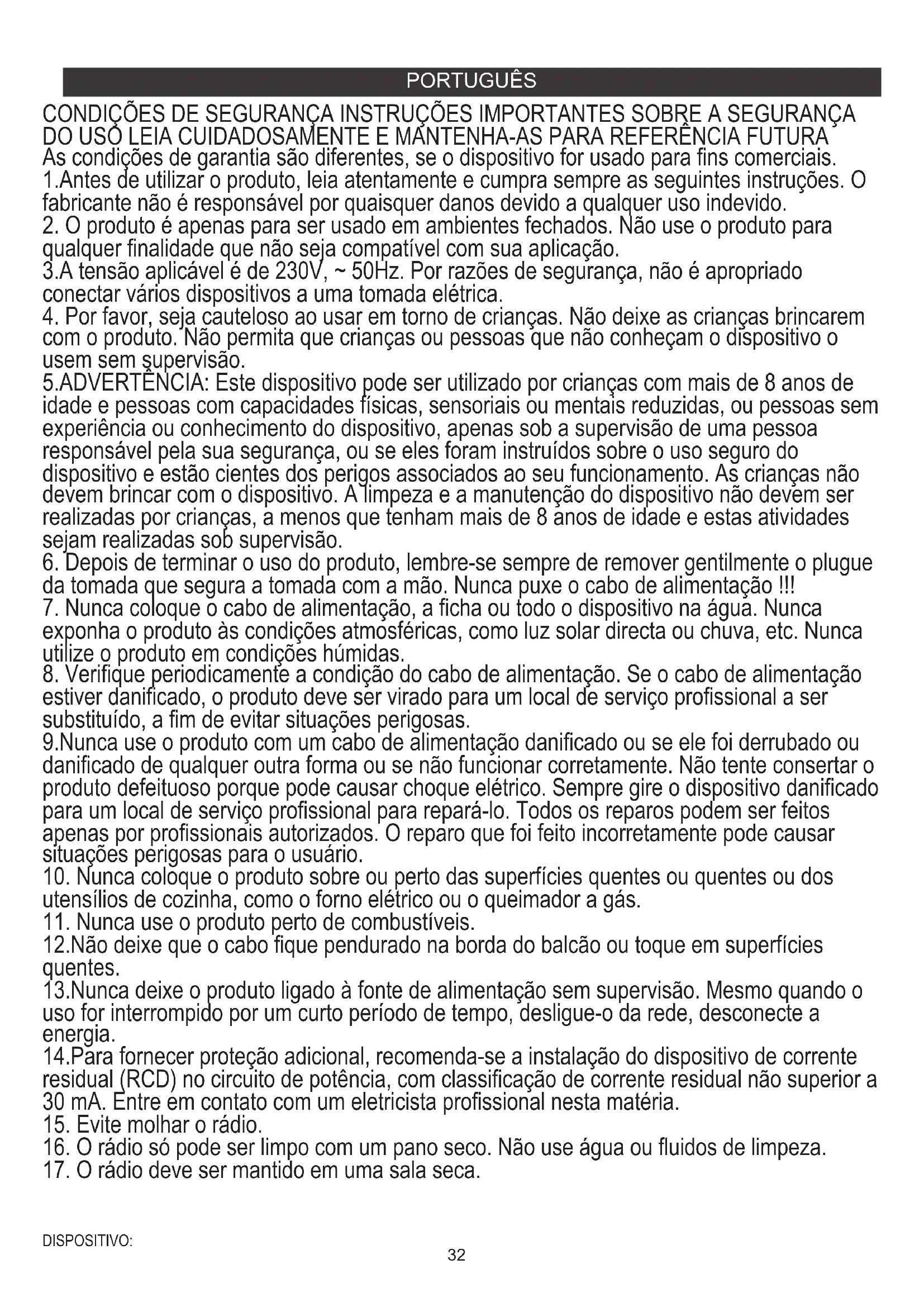 16. O rádio só pode ser limpo com um pano seco. Não use água ou fluidos de limpeza.