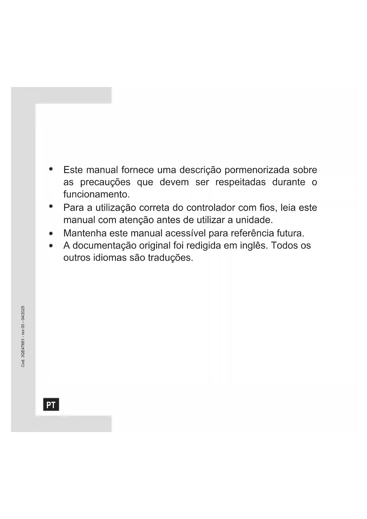 Cod. 3QE47681 - rev 00 - 04/2025Este manual fornece uma descrição pormenorizada sobre as precauções que devem ser respeitadas durante o funcionamento. Para a utilização correta do controlador com fios, leia este manual com atenção antes de utilizar a unidade. Mantenha este manual acessível para referência futura. A documentação original foi redigida em inglês. Todos os outros idiomas são traduções.