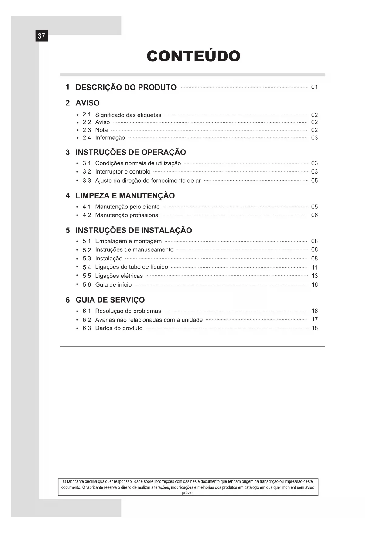 Apenas um profissional pode desmontar a unidade. O sistema com anticongelante não deve ser descartado. Caso contrário, irá causar poluição. Deve ser recolhido e, em seguida, eliminado corretamente. Como lixo especial, os componentes eletrónicos devem ser manuseados por profissionais, bem como a espuma de poliuretano, o poliuretano e a esponja de absorção de som.