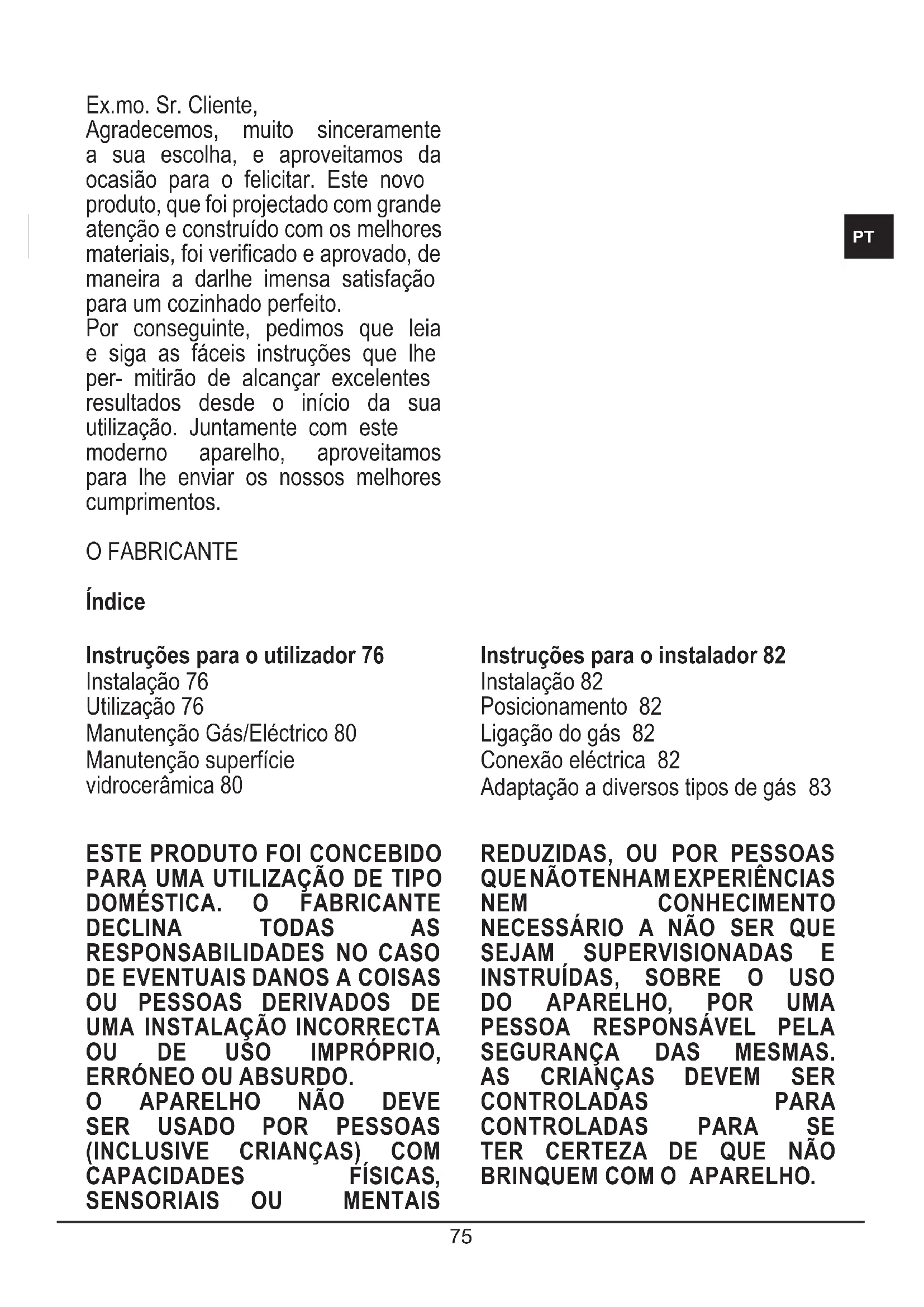Ex.mo. Sr. Cliente, Agradecemos, muito sinceramente a sua escolha, e aproveitamos da ocasião para o felicitar. Este novo produto, que foi projectado com grande atenção e construído com os melhores materiais, foi vericado e aprovado, de maneira a darlhe imensa satisfação para um cozinhado perfeito. Por conseguinte, pedimos que leia e siga as fáceis instruções que lhe per- mitirão de alcançar excelentes resultados desde o início da sua utilização. Juntamente com este moderno aparelho, aproveitamos para lhe enviar os nossos melhores cumprimentos. O FABRICANTE Índice Instruções para o utilizador 76 Instalação 76 Utilização 76 Manutenção Gás/Eléctrico 80 Manutenção superfície vidrocerâmica 80 Instruções para o instalador 82 Instalação 82 Posicionamento 82 Ligação do gás 82 Conexão eléctrica 82 Adaptação a diversos tipos de gás 83