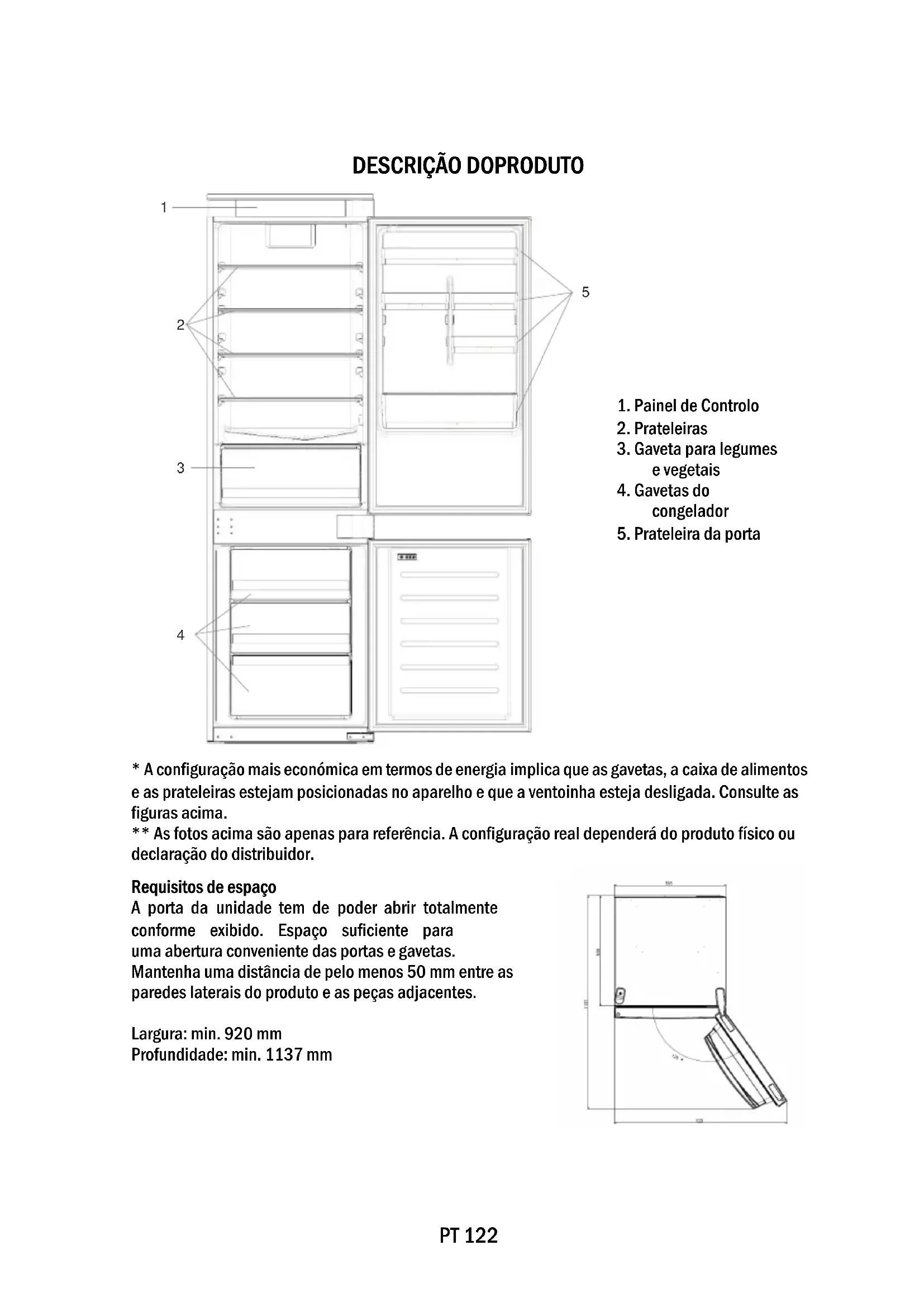 Requisitos de espaço A porta da unidade tem de poder abrir totalmente conforme exibido. Espaço suficiente para uma abertura conveniente das portas e gavetas. Mantenha uma distância de pelo menos 50 mm entre as paredes laterais do produto e as peças adjacentes. Largura: min. 920 mm Profundidade: min. 1137 mmPT 123 UTILIZAÇÃO A. Tecla ON/OFF, utilizada para ligar/desligar o aparelho B. Tecla Wi-Fi, utilizada para ligar/desligar o Wi-Fi C. Tecla SET, utilizada para selecionar as funções especiais (Eco e feriados) D. Tecla TEMP, utilizada para selecionar a temperatura do frigorífico e do congelador a. Ícone frigorífico/congelador mostra qual a área do aparelho que está selecionada b. Níveis de temperatura do frigorífico, mostram a temperatura selecionada c. Ícone Super Cool, mostra se a função Super Cool está ativada d. Níveis de temperatura do congelador, mostram qual a temperatura selecionada no congelador e. O ícone Super Freeze, mostra se a função Super Freeze está ativada f. Ícone de temperatura personalizado, mostra se a temperatura foi selecionada pela aplicação g. Ícone do modo Eco, mostra se o modo eco está ativado h. Ícone da função Holiday, mostra se a função de férias está ativada