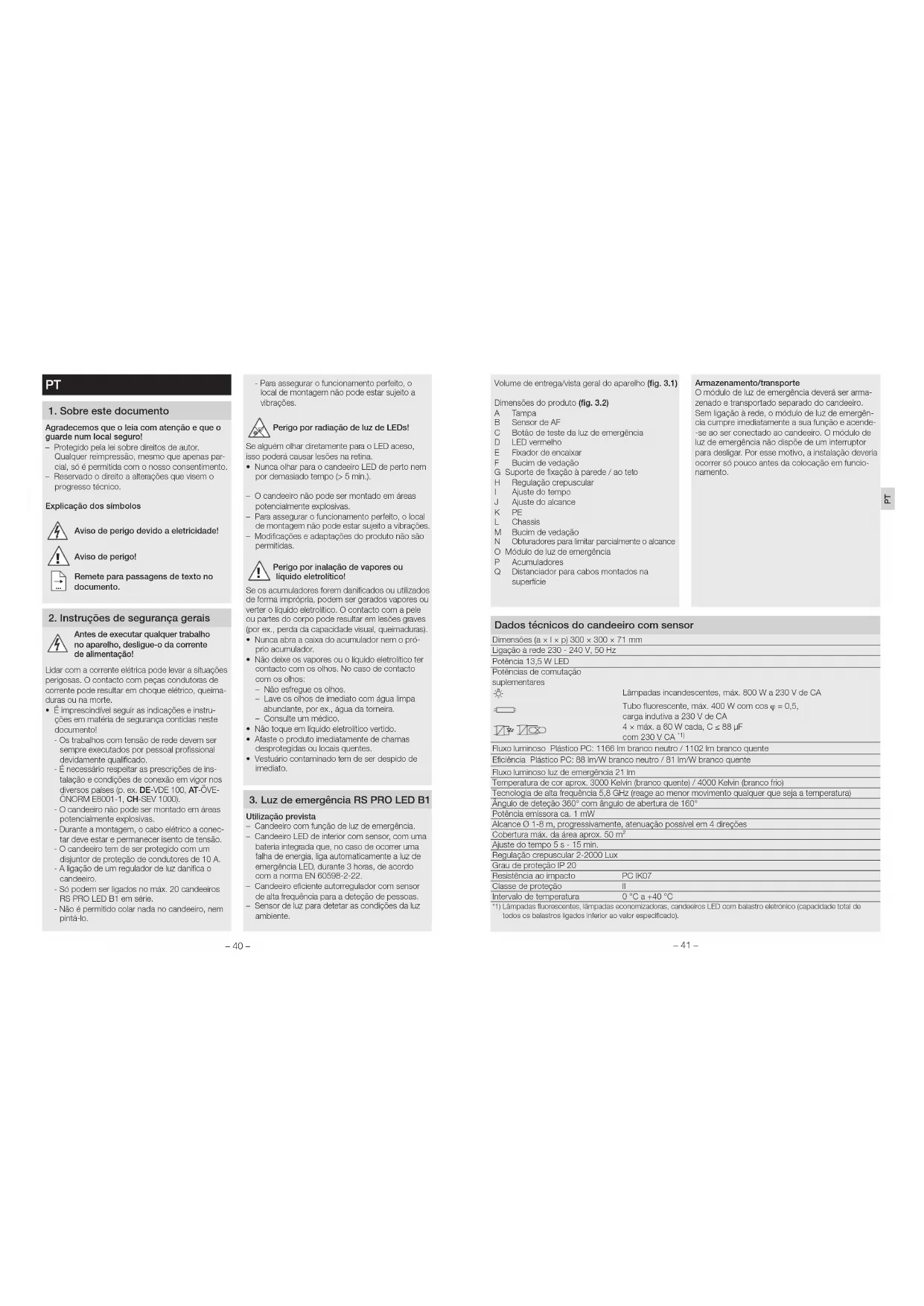Utilização prevista – Candeeiro com função de luz de emergência. – Candeeiro LED de interior com sensor, com uma bateria integrada que, no caso de ocorrer uma falha de energia, liga automaticamente a luz de emergência LED, durante 3 horas, de acordo com a norma EN 60598-2-22. – Candeeiro eficiente autorregulador com sensor de alta frequência para a deteção de pessoas. – Sensor de luz para detetar as condições da luz ambiente. Volume de entrega/vista geral do aparelho (fig. 3.1) Dimensões do produto (fig. 3.2) A Tampa B Sensor de AF C Botão de teste da luz de emergência D LED vermelho E Fixador de encaixar F Bucim de vedação G Suporte de fixação à parede / ao teto H Regulação crepuscular I Ajuste do tempo J Ajuste do alcance K PE L Chassis M Bucim de vedação N Obturadores para limitar parcialmente o alcance O Módulo de luz de emergência P Acumuladores Q Distanciador para cabos montados na superfície Armazenamento/transporte O módulo de luz de emergência deverá ser arma- zenado e transportado separado do candeeiro. Sem ligação à rede, o módulo de luz de emergên- cia cumpre imediatamente a sua função e acende- -se ao ser conectado ao candeeiro. O módulo de luz de emergência não dispõe de um interruptor para desligar. Por esse motivo, a instalação deveria ocorrer só pouco antes da colocação em funcio- namento. Dados técnicos do candeeiro com sensorPT 3 unid. Panasonic NiMh, HHR 80AAAB, 1,2 V/750 mAH, AAA Carga permanente do acumulador com aprox. 23 mAh, não provoca auto-aquecimento Tempo de carga: 24 h (tensão de rede permanente) Sem efeito memória Capacidade do acumulador/duração luz de emergência: no mín. 3 h*