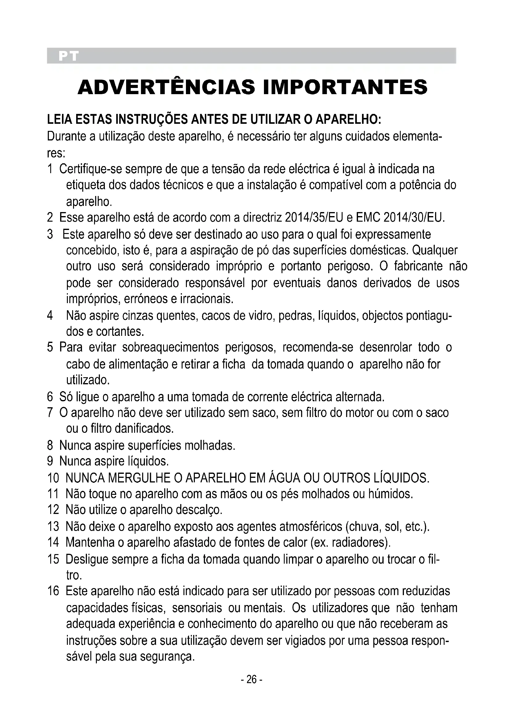 LEIA ESTAS INSTRUÇÕES ANTES DE UTILIZAR o APARELHo: Durante a utilização deste aparelho, é necessário ter alguns cuidados elementa- res: 1 Certifique-se sempre de que a tensão da rede eléctrica é igual à indicada na etiqueta dos dados técnicos e que a instalação é compatível com a potência do aparelho. 2 Esse aparelho está de acordo com a directriz 2014/35/EU e EMC 2014/30/EU. 3 Este aparelho só deve ser destinado ao uso para o qual foi expressamente concebido, isto é, para a aspiração de pó das superfícies domésticas. Qualquer outro uso será considerado impróprio e portanto perigoso. O fabricante não pode ser considerado responsável por eventuais danos derivados de usos impróprios, erróneos e irracionais.