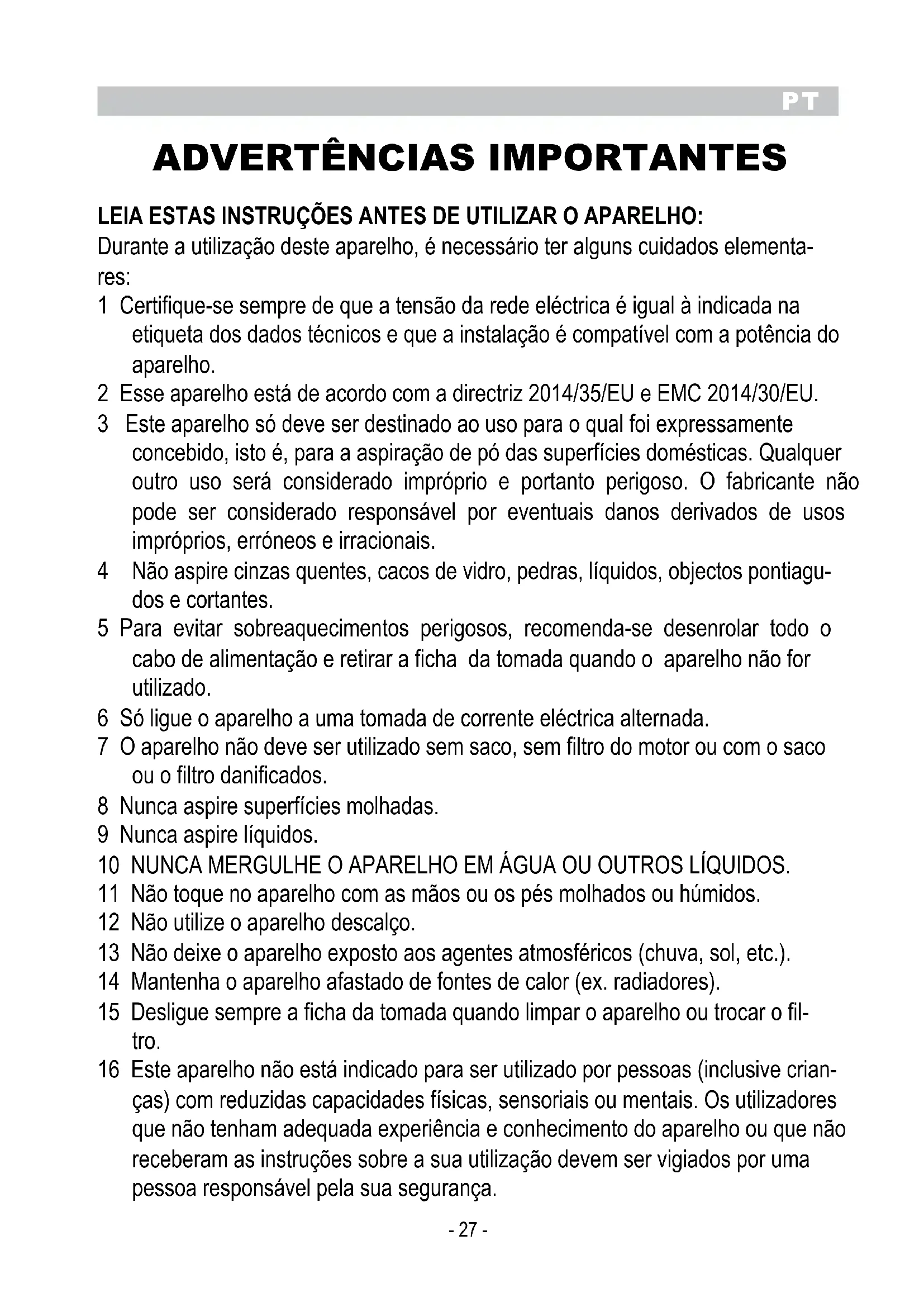 LEIA ESTAS INSTRUÇÕES ANTES DE UTILIZAR O APARELHO: Durante a utilização deste aparelho, é necessário ter alguns cuidados elementa- res: 1 Certifique-se sempre de que a tensão da rede eléctrica é igual à indicada na etiqueta dos dados técnicos e que a instalação é compatível com a potência do aparelho. 2 Esse aparelho está de acordo com a directriz 2014/35/EU e EMC 2014/30/EU. 3 Este aparelho só deve ser destinado ao uso para o qual foi expressamente concebido, isto é, para a aspiração de pó das superfícies domésticas. Qualquer outro uso será considerado impróprio e portanto perigoso. O fabricante não pode ser considerado responsável por eventuais danos derivados de usos impróprios, erróneos e irracionais.