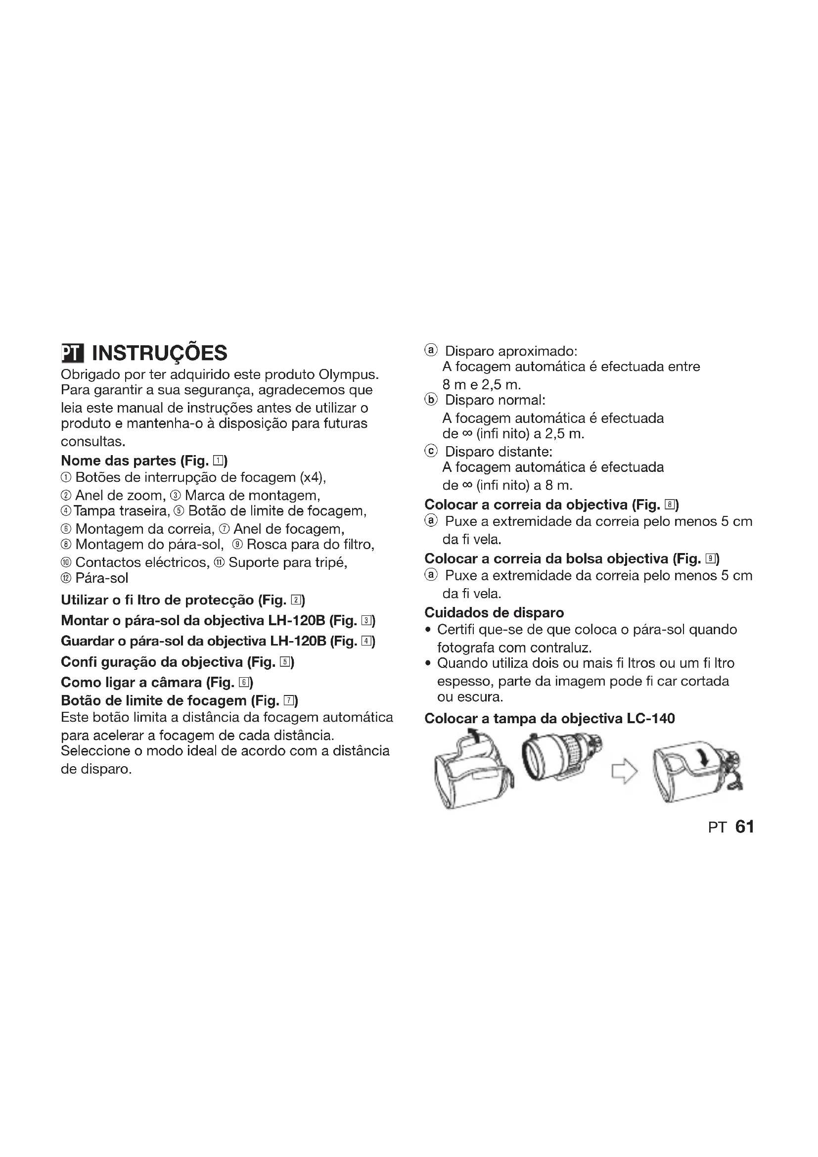 - PT 61 INSTRUÇÕES Obrigado por ter adquirido este produto Olympus. Para garantir a sua segurança, agradecemos que leia este manual de instruções antes de utilizar o produto e mantenha-o à disposição para futuras consultas. Nome das partes (Fig. 1) 1 Botões de interrupção de focagem (x4), 2 Anel de zoom, 3 Marca de montagem, 4 Tampa traseira, 5 Botão de limite de focagem, 6 Montagem da correia, 7 Anel de focagem, 8 Montagem do pára-sol, 9 Rosca para do fi ltro, 0 Contactos eléctricos, q Suporte para tripé, w Pára-sol Utilizar o fi ltro de protecção (Fig. 2) Montar o pára-sol da objectiva LH-120B (Fig. 3) Guardar o pára-sol da objectiva LH-120B (Fig. 4) Confi guração da objectiva (Fig. 5) Como ligar a câmara (Fig. 6) Botão de limite de focagem (Fig. 7) Este botão limita a distância da focagem automática para acelerar a focagem de cada distância. Seleccione o modo ideal de acordo com a distância de disparo.