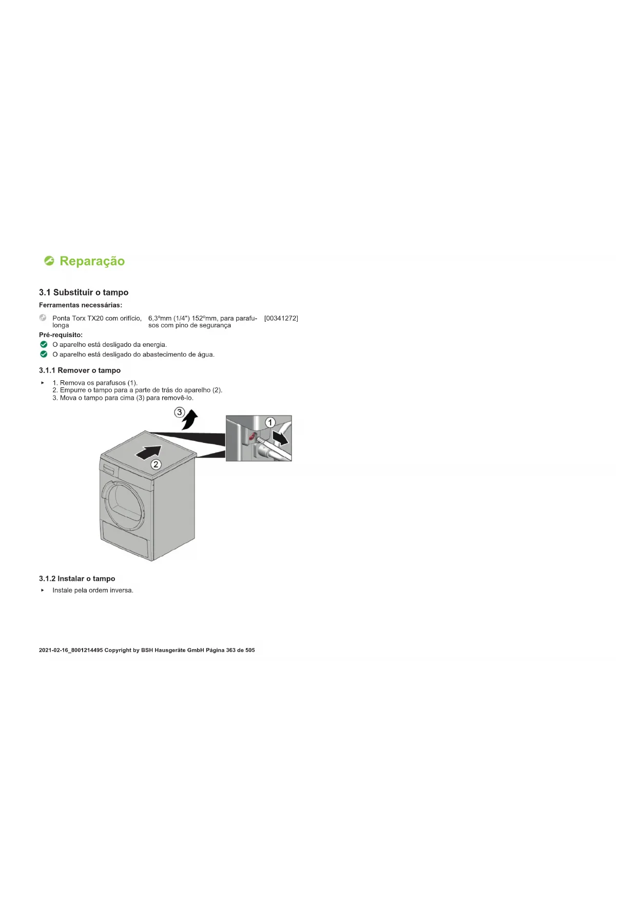 Instale pela ordem inversa. Reparação 2021-02-16_8001214495 Copyright by BSH Hausgeräte GmbH Página372de5053.8 Substituir o dispositivo de bloqueio da porta Na qualidade de fabricante, somos obrigados a fornecer aos consumidores um dispo- sitivo de bloqueio da porta sobressalente incluindo as instruções de reparação de acordo com o Regulamento (UE) 2019/2023. Contudo, gostaríamos de salientar que após a substituição de um dispositivo de bloqueio da porta, é necessário um teste de segurança eletrotécnica realizado por um profissional qualificado antes de colocar o dispositivo em funcionamento. Tem de ser possível verificar a qualificação da pessoa em questão de acordo com as leis, regulamentos e normas específicas do país. PERIGO Risco de choque elétrico devido a partes sob tensão! Risco de vida devido a choque elétrico em caso de reparação inadequa-