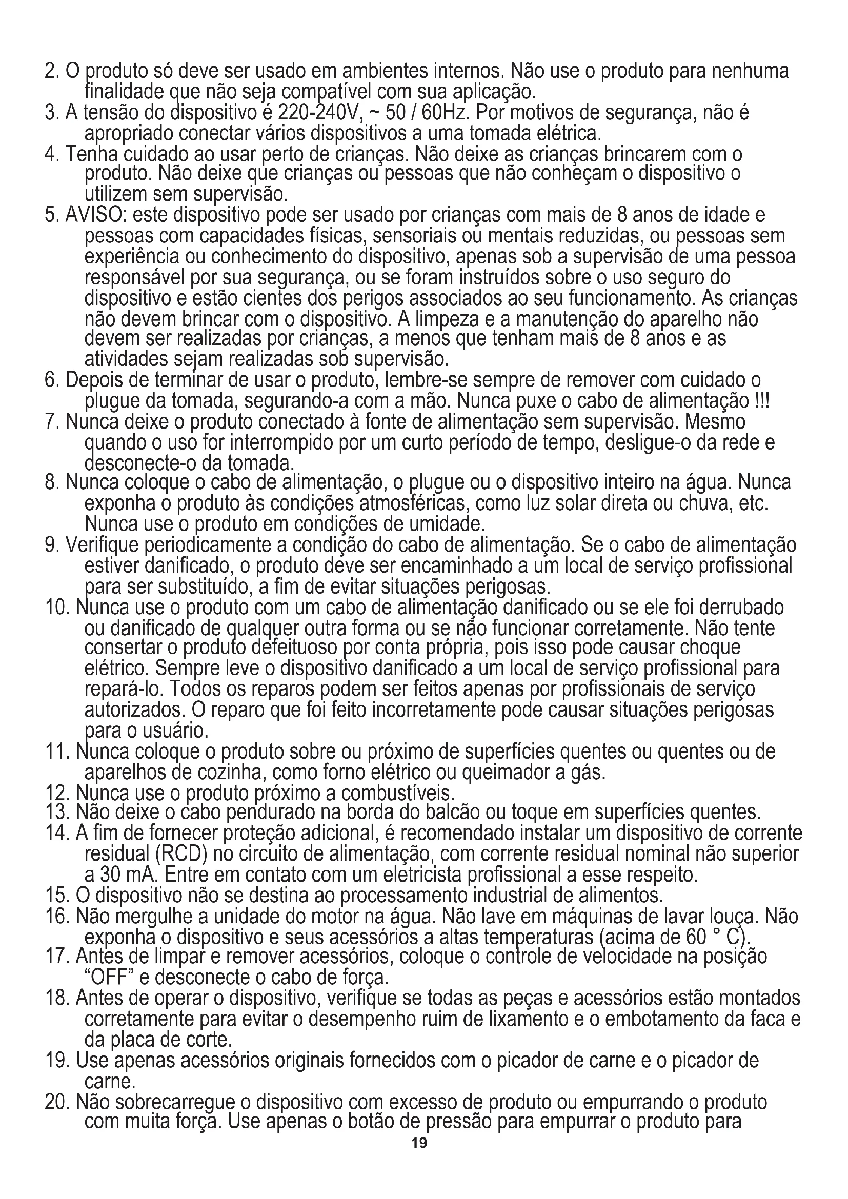 20. Não sobrecarregue o dispositivo com excesso de produto ou empurrando o produto