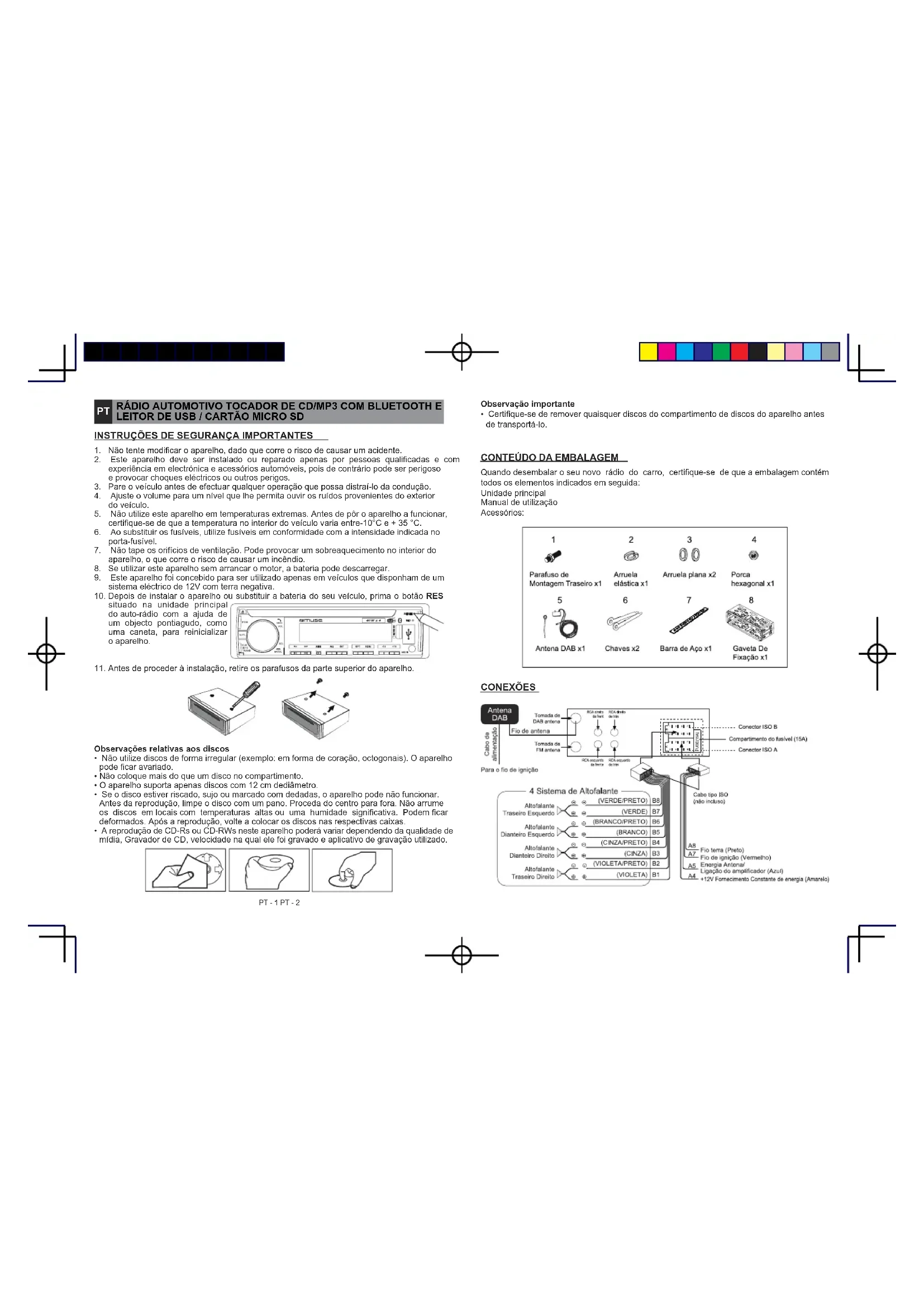 ATENÇÃO! - Certique-se de que efectua as ligações tendo em conta as cores indicadas na ilustração de ligação. Uma ligação incorrecta pode provocar uma avaria do aparelho ou danicar o sistema eléctrico do veículo. - Certique-se de que liga o conector negativo da coluna à tomada negativa e o conector positivo à tomada positiva. Nunca ligue os cabos das colunas direita e esquerda um ao outro ou a uma parte metálica do veículo. - Verique se as ligações estão correctas antes de pôr o aparelho a funcionar. O aparelho é instalado com proteção antifurto. O chassi do aparelho possui um compartimento destacável de metal. Faca a conexão de energia dos alto falantes e antena de acordo com os requisitos do manual de instruções, para fazer a instalação do compartimento destacável adequadamente. Não ligue o cabo de ligação (vermelho) e o da bateria (amarelo). Pode provocar um curto-circuito, ou mesmo um incêndio.