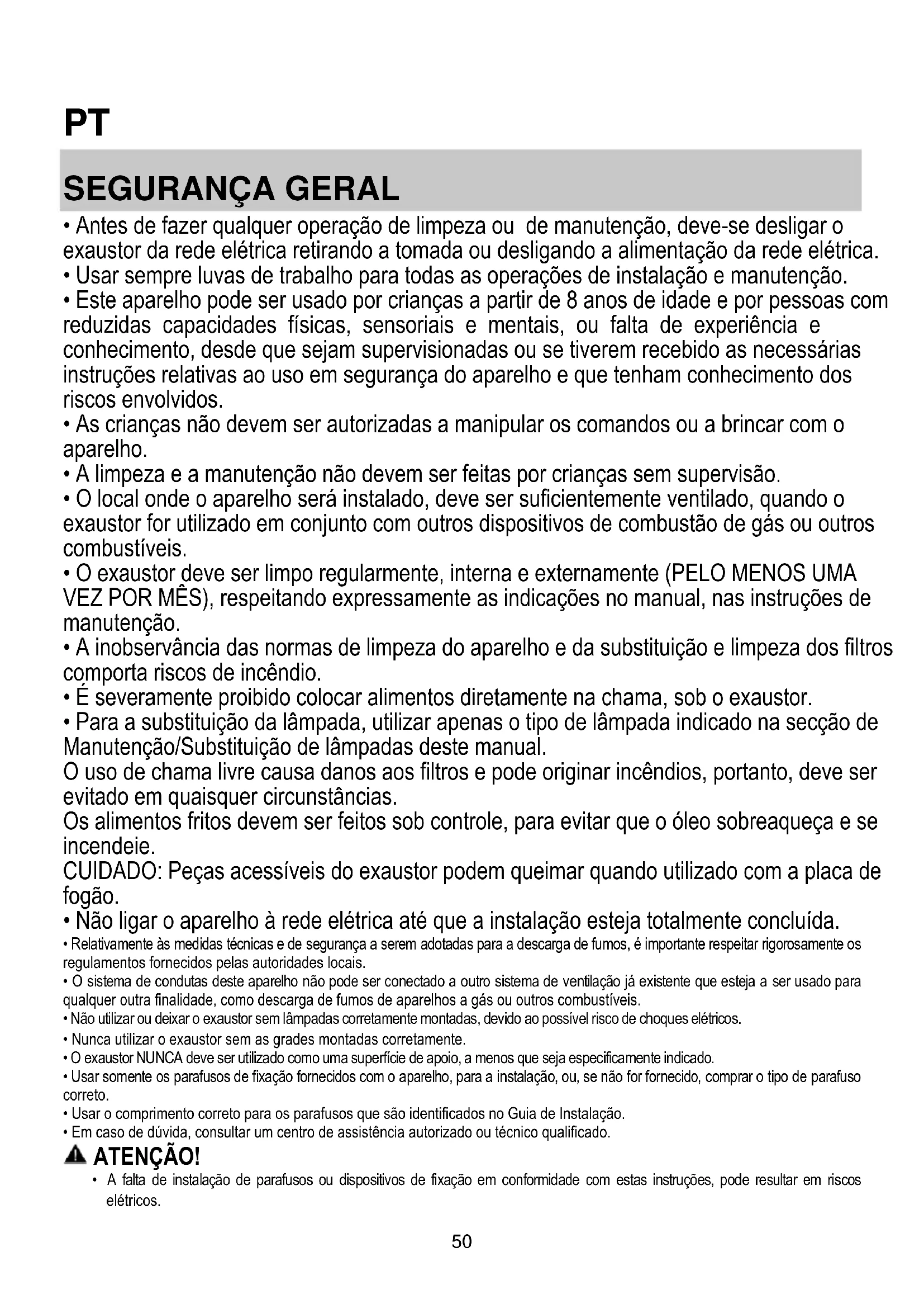 Substituição do cabo de alimentação O exaustor está equipado com um cabo de alimentação especial; no caso do cabo ficar danificado, efetuar um pedido ao serviço de assistência técnica.52